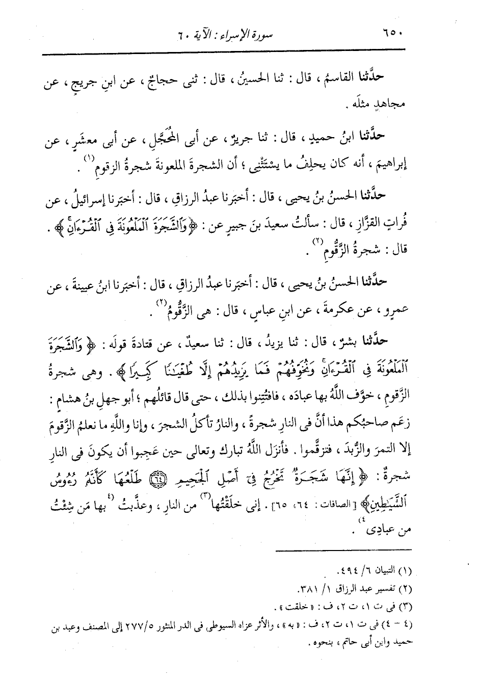حَدَّثَنَا بِشْرٌ، قَالَ: ثنا يَزِيدُ، قَالَ: ثنا سَعِيدٌ، عَنْ قَتَادَةَ، قَوْلُهُ {§وَالشَّجَرَةَ الْمَلْعُونَةَ فِي الْقُرْآنِ وَنُخَوِّفُهُمْ فَمَا يَزِيدُهُمْ إِلَّا طُغْيَانًا كَبِيرًا} [الإسراء: 60] وَهِيَ شَجَرَةُ الزَّقُّومِ، خَوَّفَ اللَّهُ بِهَا عِبَادَهُ، فَافْتَتَنُوا بِذَلِكَ، حَتَّى قَالَ قَائِلُهُمْ أَبُو جَهْلِ بْنُ هِشَامٍ زَعَمَ صَاحِبُكُمْ هَذَا أَنَّ فِيَ النَّارِ شَجَرَةً، وَالنَّارُ تَأْكُلُ الشَّجَرَ، وَإِنَّا وَاللَّهِ مَا نَعْلَمُ الزَّقُّومَ إِلَّا التَّمْرُ وَالزُّبْدُ، فَتَزَقَّمُوا، فَأَنْزَلَ اللَّهُ تَبَارَكَ وَتَعَالَى حِينَ عَجِبُوا أَنْ يَكُونَ فِي النَّارِ شَجَرَةٌ: {إِنَّهَا شَجَرَةٌ تَخْرُجُ فِي أَصْلِ الْجَحِيمِ طَلْعُهَا كَأَنَّهُ رُءُوسُ الشَّيَاطِينِ} إِنِّي خَلَقْتُهَا مِنَ النَّارِ، وَعَذَّبْتُ بِهَا مَنْ شِئْتُ مِنْ عِبَادِي