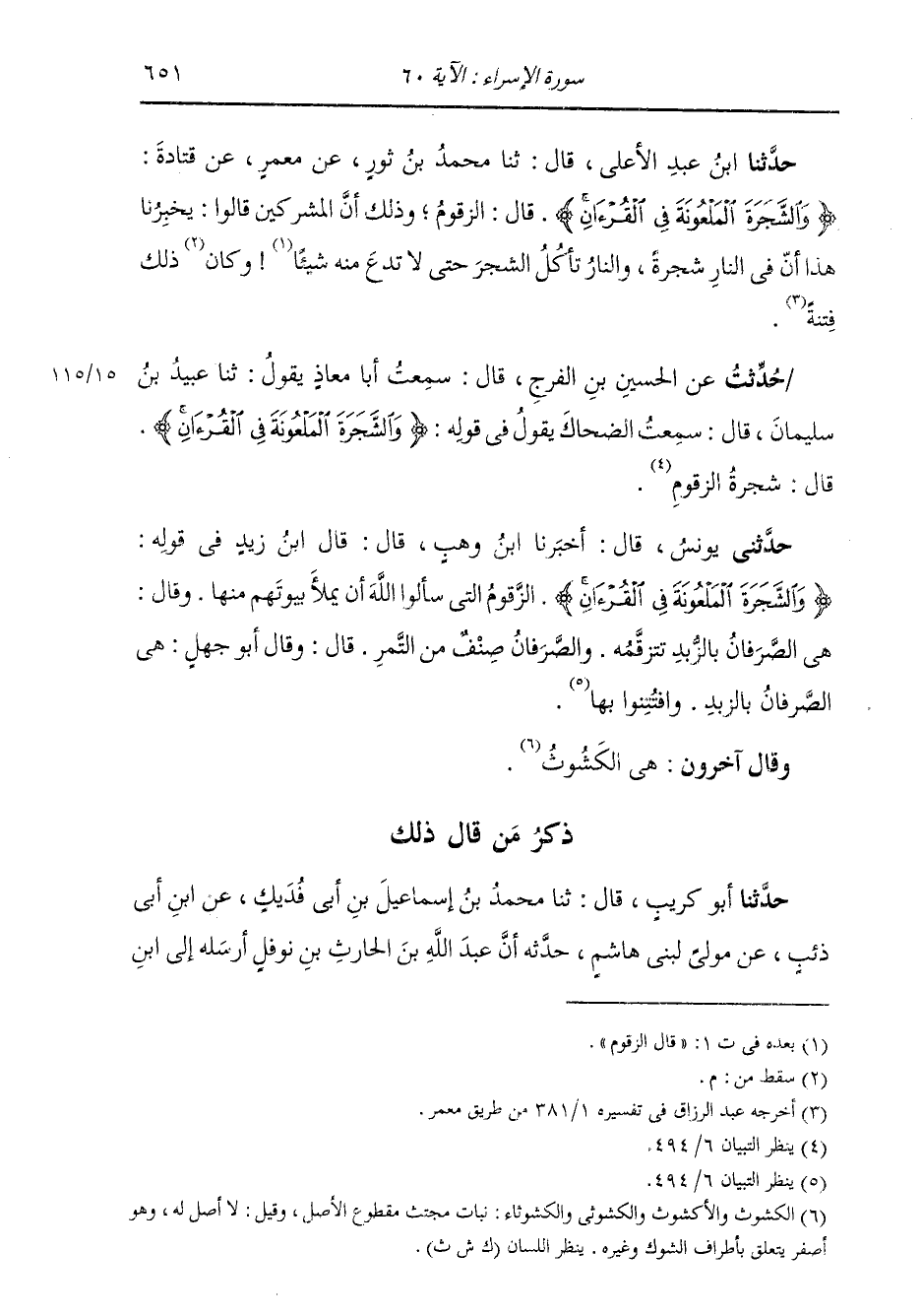 حَدَّثَنَا ابْنُ عَبْدِ الْأَعْلَى، قَالَ: ثنا مُحَمَّدُ بْنُ ثَوْرٍ، عَنْ مَعْمَرٍ، عَنْ قَتَادَةَ {§وَالشَّجَرَةَ الْمَلْعُونَةَ فِي الْقُرْآنِ} [الإسراء: 60] قَالَ: الزَّقُّومُ، وَذَلِكَ أَنَّ الْمُشْرِكِينَ قَالُوا: يُخْبِرُنَا هَذَا أَنَّ فِيَ النَّارِ شَجَرَةً، وَالنَّارُ تَأْكُلُ الشَّجَرَ حَتَّى لَا تَدَعُ مِنْهُ شَيْئًا، وَذَلِكَ فِتْنَةٌ