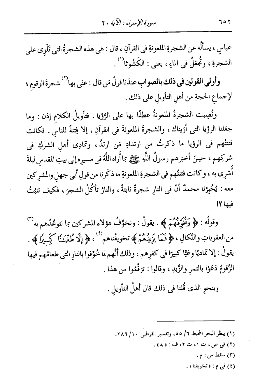 عَبَّاسٍ، يَسْأَلُهُ عَنِ الشَّجَرَةِ الْمَلْعُونَةِ، فِي الْقُرْآنِ؟ قَالَ: هِيَ هَذِهِ §الشَّجَرَةُ الَّتِي تُلْوَى عَلَى الشَّجَرَةِ، وَتُجْعَلُ فِي الْمَاءِ، يَعْنِي الْكَشُوثِي وَأَوْلَى الْقَوْلَيْنِ فِي ذَلِكَ بِالصَّوَابِ عِنْدَنَا قَوْلُ مَنْ قَالَ: عَنَى بِهَا شَجَرَةَ الزَّقُّومِ، لِإِجْمَاعِ الْحُجَّةِ مِنْ أَهْلِ التَّأْوِيلِ عَلَى ذَلِكَ. وَنُصِبَتِ الشَّجَرَةُ الْمَلْعُونَةُ عَطْفَا بِهَا عَلَى الرُّؤْيَا. فَتَأْوِيلُ الْكَلَامِ إِذَنْ: وَمَا جَعَلْنَا الرُّؤْيَا الَّتِي أَرَيْنَاكَ وَالشَّجَرَةَ الْمَلْعُونَةَ فِي الْقُرْآنِ إِلَّا فِتْنَةً لِلنَّاسٍ، فَكَانَتْ فِتْنَتُهُمْ فِي الرُّؤْيَا مَا ذَكَرْتُ مِنَ ارْتِدَادِ مَنِ ارْتَدَّ، وَتَمَادِي أَهْلِ الشِّرْكِ فِي شِرْكِهِمْ، حِينَ أَخْبَرَهُمْ رَسُولُ اللَّهِ صَلَّى اللهُ عَلَيْهِ وَسَلَّمَ بِمَا أَرَاهُ اللَّهُ فِي مَسِيرِهِ إِلَى بَيْتِ الْمَقْدِسِ لَيْلَةَ أُسْرِيَ بِهِ. وَكَانَتْ فِتْنَتُهُمْ فِي الشَّجَرَةِ الْمَلْعُونَةِ مَا ذَكَرْنَا مِنْ قَوْلِ أَبِي جَهْلٍ وَالْمُشْرِكِينَ مَعَهُ: يُخْبِرُنَا مُحَمَّدٌ أَنَّ فِيَ النَّارِ شَجَرَةً نَابِتَةً، وَالنَّارُ تَأْكُلُ الشَّجَرَ فَكَيْفَ تَنْبُتُ فِيهَا؟