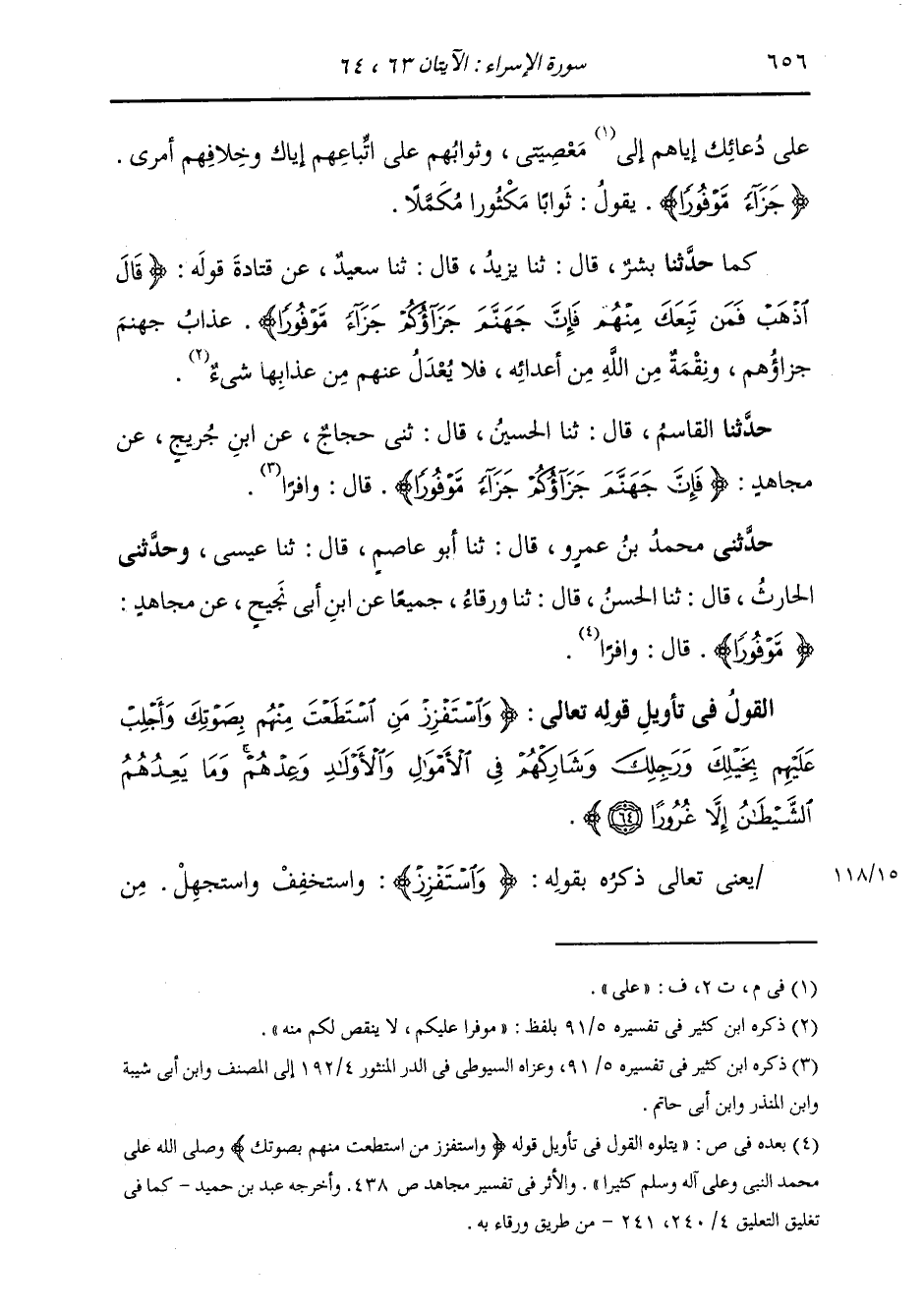حَدَّثَنِي مُحَمَّدُ بْنُ عَمْرٍو، قَالَ: ثنا أَبُو عَاصِمٍ، قَالَ: ثنا عِيسَى، وَحَدَّثَنِي الْحَارِثُ، قَالَ: ثنا الْحَسَنُ قَالَ: ثنا وَرْقَاءُ، جَمِيعًا عَنِ ابْنِ أَبِي نَجِيحٍ، عَنْ مُجَاهِدٍ {§مَوْفُورًا} [الإسراء: 63] قَالَ: وَافِرًا
