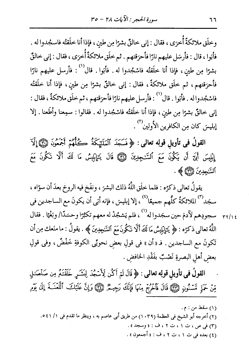 §الْقَوْلُ فِي تَأْوِيلِ قَوْلِهِ تَعَالَى: {فَسَجَدَ الْمَلَائِكَةُ كُلُّهُمْ أَجْمَعُونَ. إِلَّا إِبْلِيسَ أَبَى أَنْ يَكُونَ مَعَ السَّاجِدِينَ. قَالَ يَا إِبْلِيسُ مَا لَكَ أَلَّا تَكُونَ مَعَ السَّاجِدِينَ} [الحجر: 31] يَقُولُ تَعَالَى ذِكْرُهُ: فَلَمَّا خَلَقَ اللَّهُ ذَلِكَ الْبَشَرَ وَنَفَخَ فِيهِ الرُّوحَ بَعْدَ أَنْ سَوَّاهُ، سَجَدَ الْمَلَائِكَةُ كُلُّهُمْ جَمِيعًا إِلَّا إِبْلِيسَ فَإِنَّهُ أَبَى أَنْ يَكُونَ مَعَ السَّاجِدِينَ فِي سُجُودِهِمْ لِآدَمَ حِينَ سَجَدُوا، فَلَمْ يَسْجُدْ لَهُ مَعَهُمْ تَكَبُّرًا وَحَسَدًا وَبَغْيًا. قَالَ اللَّهُ تَعَالَى ذِكْرُهُ: {يَا إِبْلِيسُ مَا لَكَ أَلَّا تَكُونَ مَعَ السَّاجِدِينَ} [الحجر: 32] يَقُولُ: مَا مَنَعَكَ مِنْ أَنْ تَكُونَ مَعَ السَّاجِدِينَ؟ فَ «أَنْ» فِي قَوْلِ بَعْضِ نَحْوِيِّي الْكُوفَةِ خَفْضٌ، وَفِي قَوْلِ بَعْضِ أَهْلِ الْبَصْرَةِ نَصْبٌ بِفَقْدِ الْخَافِضِ