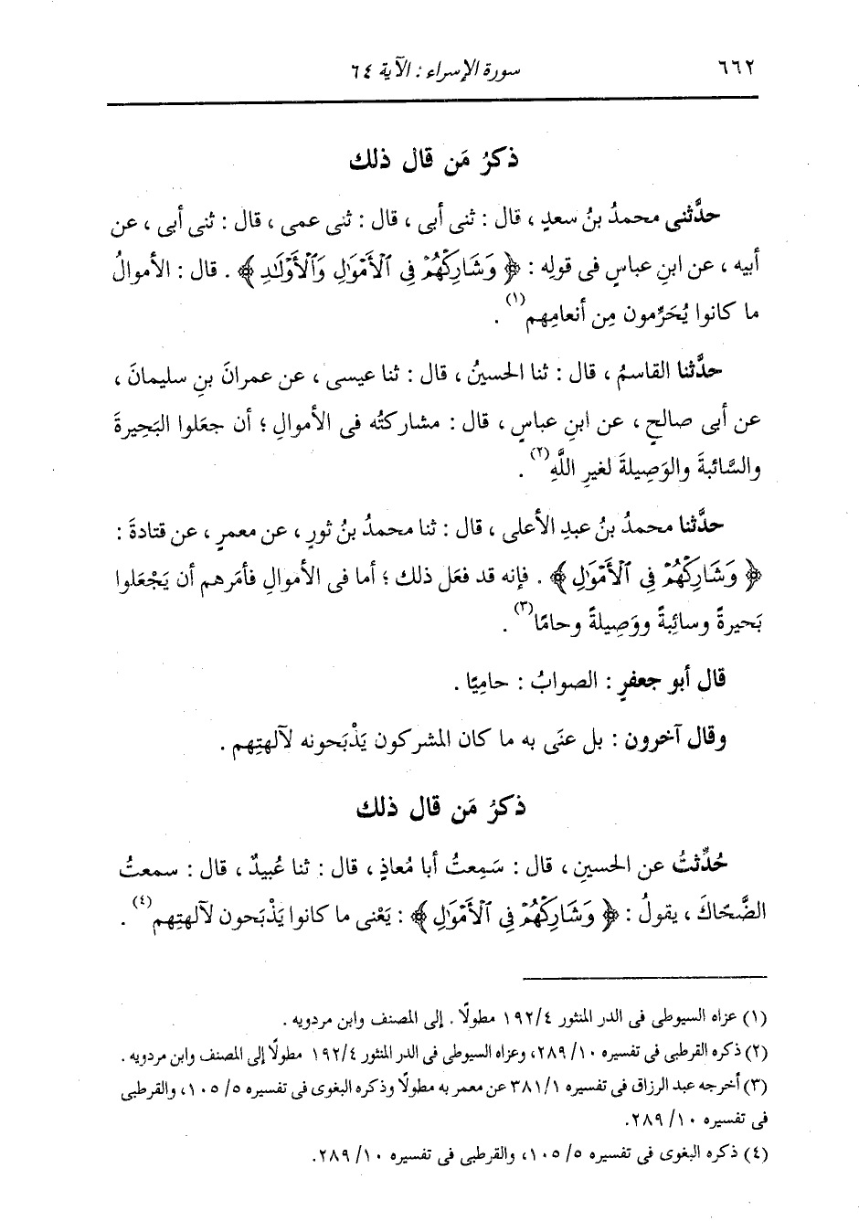 حَدَّثَنَا مُحَمَّدُ بْنُ عَبْدِ الْأَعْلَى، قَالَ: ثنا مُحَمَّدُ بْنُ ثَوْرٍ، عَنْ مَعْمَرٍ، عَنْ قَتَادَةَ، {§وَشَارِكْهُمْ فِي الْأَمْوَالِ} [الإسراء: 64] فَإِنَّهُ قَدْ فَعَلَ ذَلِكَ، أَمَّا فِي الْأَمْوَالِ، فَأَمَرَهُمْ أَنْ يَجْعَلُوا بَحِيرَةً وَسَائِبَةً وَوَصِيلَةً وَحَامًا قَالَ أَبُو جَعْفَرٍ: الصَّوَابُ: حَامِيًا. وَقَالَ آخَرُونَ: بَلْ عَنَى بِهِ مَا كَانَ الْمُشْرِكُونَ يَذْبَحُونَهُ لِآلِهَتِهِمْ