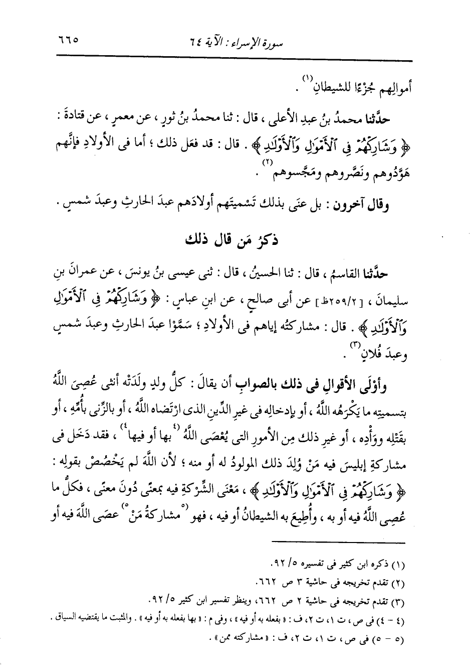 ذِكْرُ مَنْ قَالَ ذَلِكَ: حَدَّثَنَا الْقَاسِمُ، قَالَ: ثنا الْحُسَيْنُ، قَالَ: ثني عِيسَى بْنُ يُونُسَ، عَنْ عِمْرَانَ بْنِ سُلَيْمَانَ، عَنْ أَبِي صَالِحٍ، عَنِ ابْنِ عَبَّاسٍ، {§وَشَارِكْهُمْ فِي الْأَمْوَالِ وَالْأَوْلَادِ} [الإسراء: 64] قَالَ: مُشَارَكَتُهُ إِيَّاهُمْ فِي الْأَوْلَادِ، سَمُّوا عَبْدَ الْحَارِثِ وَعَبْدَ شَمْسٍ وَعَبْدَ فُلَانٍ وَأَوْلَى الْأَقْوَالِ فِي ذَلِكَ بِالصَّوَابِ أَنْ يُقَالَ: كُلُّ وَلَدٍ وَلَدَتْهُ أُنْثَى عُصِيَ اللَّهُ بِتَسْمِيَتِهِ مَا يَكْرَهُهُ اللَّهُ، أَوْ بِإِدْخَالِهِ فِي غَيْرِ الدِّينِ الَّذِي ارْتَضَاهُ اللَّهُ، أَوْ بِالزِّنَا بِأُمِّهِ، أَوْ قَتْلِهِ وَوَأْدِهِ، أَوْ غَيْرِ ذَلِكَ مِنَ الْأُمُورِ الَّتِي يَعْصِي اللَّهَ بِهَا بِفِعْلِهِ بِهِ أَوْ فِيهِ، فَقَدْ دَخَلَ فِي مُشَارَكَةِ إِبْلِيسَ فِيهِ مِنْ وَلَدِ ذَلِكَ الْمَوْلُودِ لَهُ أَوْ مِنْهُ، لِأَنَّ اللَّهَ لَمْ يُخَصِّصْ بِقَوْلِهِ {وَشَارِكْهُمْ فِي الْأَمْوَالِ وَالْأَوْلَادِ} [الإسراء: 64] مَعْنَى الشَّرِكَةِ فِيهِ بِمَعْنًى دُونَ مَعْنًى، فَكُلُّ مَا عُصِيَ اللَّهُ فِيهِ أَوْ بِهِ، وَأُطِيعَ بِهِ الشَّيْطَانُ أَوْ فِيهِ، فَهُوَ مُشَارَكَةُ مَنْ عُصِيَ اللَّهُ فِيهِ أَوْ -[666]- بِهِ إِبْلِيسَ فِيهِ