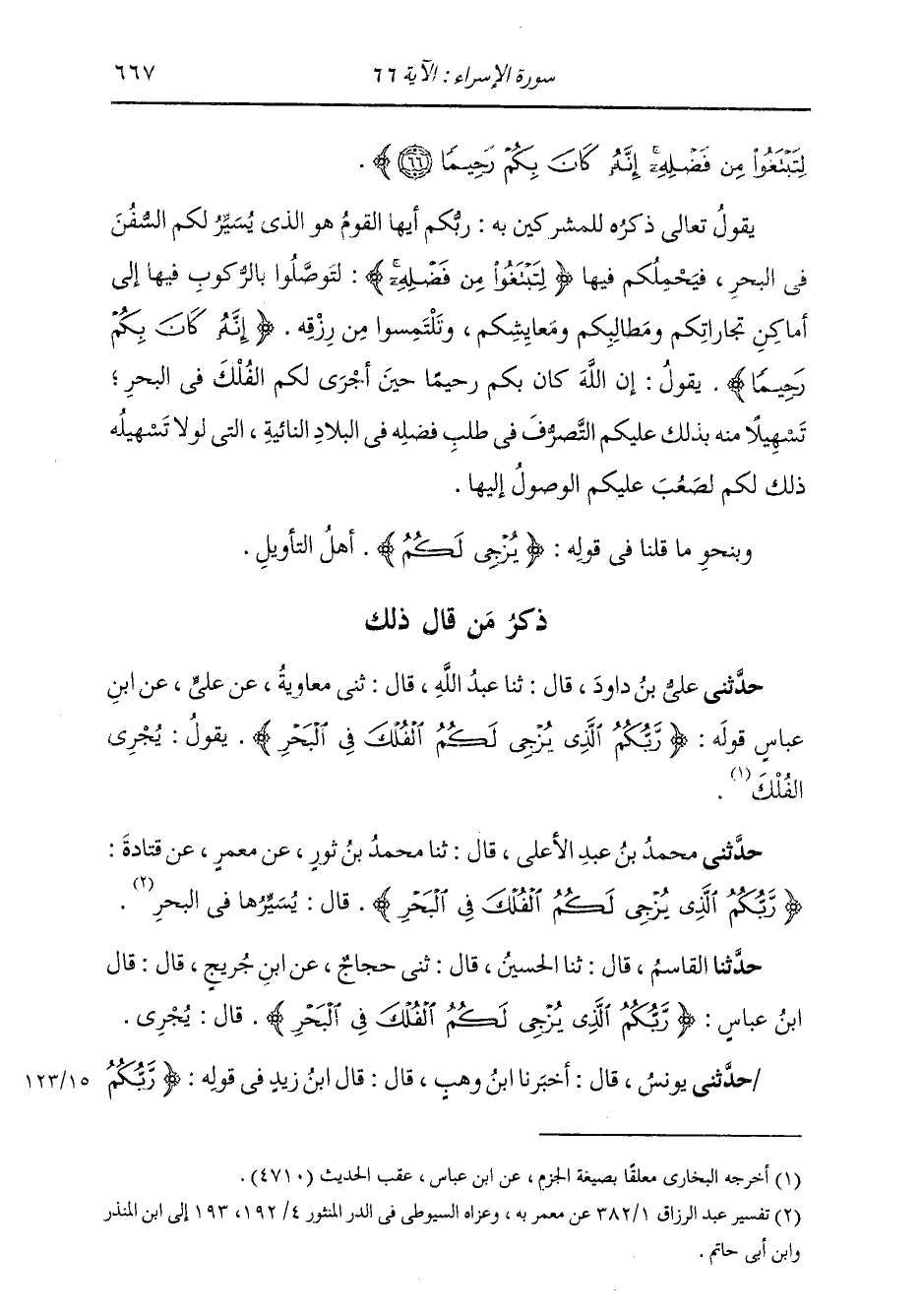 ذِكْرُ مَنْ قَالَ ذَلِكَ: حَدَّثَنِي عَلِيُّ بْنُ دَاوُدَ، قَالَ: ثنا عَبْدُ اللَّهِ، قَالَ: ثني مُعَاوِيَةُ، عَنْ عَلِيٍّ، عَنِ ابْنِ عَبَّاسٍ، قَوْلُهُ: {§رَبُّكُمُ الَّذِي يُزْجِي لَكُمُ الْفُلْكَ فِي الْبَحْرِ} [الإسراء: 66] يَقُولُ: يَجْرِي الْفُلْكَ