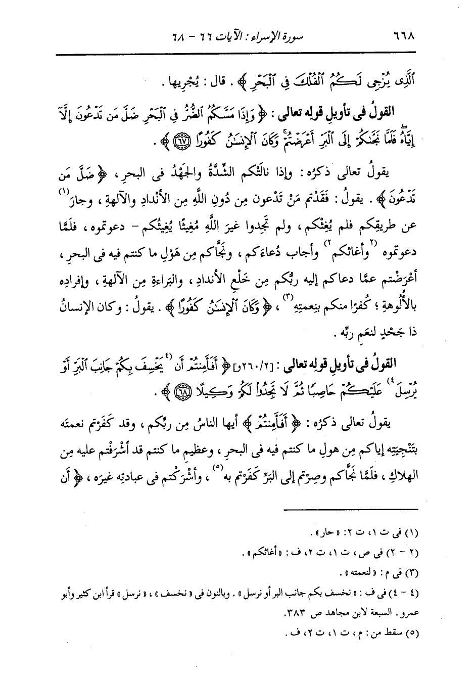 §الْقَوْلُ فِي تَأْوِيلِ قَوْلِهِ تَعَالَى: {وَإِذَا مَسَّكُمُ الضُّرُّ فِي الْبَحْرِ ضَلَّ مَنْ تَدْعُونَ إِلَّا إِيَّاهُ فَلَمَّا نَجَّاكُمْ إِلَى الْبَرِّ أَعْرَضْتُمْ وَكَانَ الْإِنْسَانُ كَفُورًا} [الإسراء: 67] يَقُولُ تَعَالَى ذِكْرُهُ: وَإِذَا نَالَتْكُمُ الشِّدَّةُ وَالْجَهْدُ فِي الْبَحْرِ ضَلَّ مَنْ تَدْعُونَ: يَقُولُ فَقَدْتُمْ مَنْ تَدْعُونَ مِنْ دُونَ اللَّهِ مِنَ الْأَنْدَادِ وَالْآلِهَةِ، وَجَارَ عَنْ طَرِيقِكُمْ فَلَمْ يُغِثْكُمْ، وَلَمْ تَجِدُوا غَيْرَ اللَّهِ مُغِيثًا يُغِيثُكُمْ دَعَوْتُمُوهُ، فَلَمَّا دَعَوْتُمُوهُ وَأَغَاثَكُمْ، وَأَجَابَ دُعَاءَكُمْ وَنَجَّاكُمْ مِنْ هَوْلِ مَا كُنْتُمْ فِيهِ فِي الْبَحْرِ أَعْرَضْتُمْ عَمَّا دَعَاكُمْ إِلَيْهِ رَبُّكُمْ مِنْ خَلْعِ الْأَنْدَادِ وَالْبَرَاءَةِ مِنَ الْآلِهَةِ، وَإِفْرَادِهِ بِالْأُلُوهَةِ كُفْرًا مِنْكُمْ بِنِعْمَتِهِ {وَكَانَ الْإِنْسَانُ كَفُورًا} [الإسراء: 67] يَقُولُ: وَكَانَ الْإِنْسَانُ إِذًا جَحَدَ لِنِعَمِ رَبِّهِ