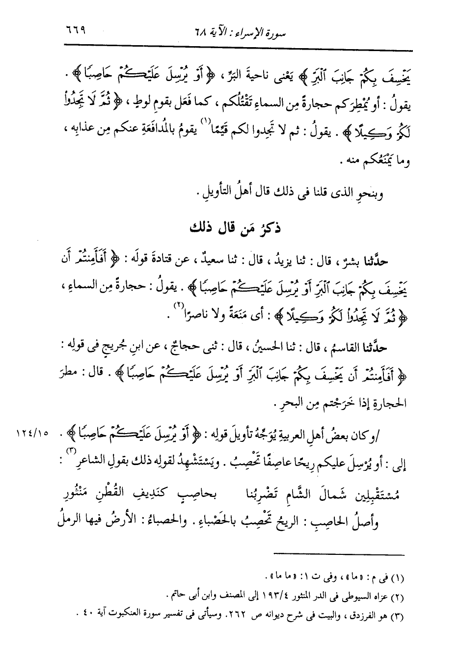 حَدَّثَنَا الْقَاسِمُ، قَالَ: ثنا الْحُسَيْنُ، قَالَ: ثني حَجَّاجٌ، عَنِ ابْنِ جُرَيْجٍ، فِي قَوْلِهِ: {§أَفَأَمِنْتُمْ أَنْ يَخْسِفَ بِكُمْ جَانِبَ الْبَرِّ أَوْ يُرْسِلَ عَلَيْكُمْ حَاصِبًا} [الإسراء: 68] قَالَ: مَطَرُ الْحِجَارَةِ إِذَا خَرَجْتُمْ مِنَ الْبَحْرِ وَكَانَ بَعْضُ أَهْلِ الْعَرَبِيَّةِ يُوَجِّهُ تَأْوِيلَ قَوْلِهِ {أَوْ يُرْسِلَ عَلَيْكُمْ حَاصِبًا} [الإسراء: 68] إِلَى: أَوْ يُرْسِلَ عَلَيْكُمْ رِيحًا عَاصِفًا تَحْصِبُ، وَيَسْتَشْهِدُ لِقَوْلِهِ ذَلِكَ بِقَوْلِ الشَّاعِرِ: