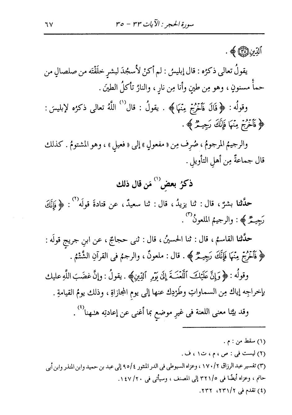 ذِكْرُ مَنْ قَالَ ذَلِكَ: حَدَّثَنَا بِشْرٌ، قَالَ: ثنا يَزِيدُ، قَالَ: ثنا سَعِيدٌ، عَنْ قَتَادَةَ: {§فَإِنَّكَ رَجِيمٌ} [الحجر: 34] " وَالرَّجِيمُ: الْمَلْعُونُ "