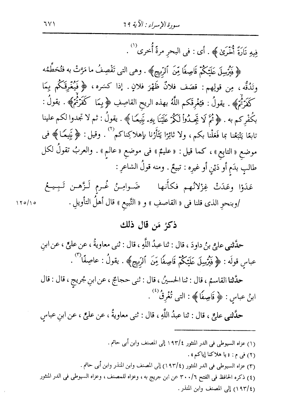 ذِكْرُ مَنْ قَالَ ذَلِكَ: حَدَّثَنِي عَلِيُّ بْنُ دَاوُدَ، قَالَ: ثنا عَبْدُ اللَّهِ، قَالَ: ثني مُعَاوِيَةُ، عَنْ عَلِيٍّ، عَنِ ابْنِ عَبَّاسٍ، قَوْلُهُ: {§فَيُرْسِلَ عَلَيْكُمْ قَاصِفًا مِنَ الرِّيحِ} [الإسراء: 69] يَقُولُ: عَاصِفًا