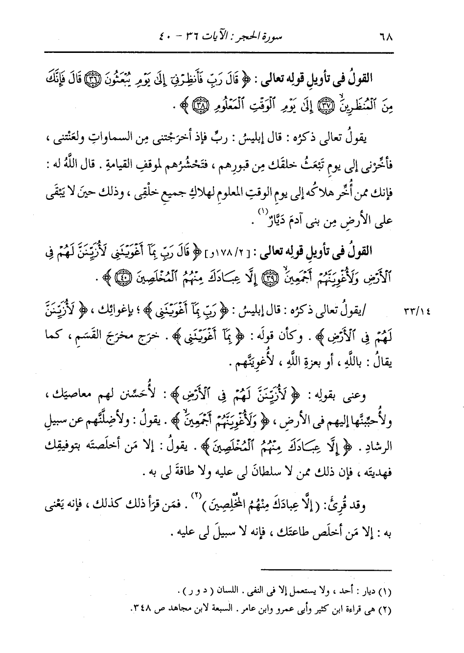 §الْقَوْلُ فِي تَأْوِيلِ قَوْلِهِ تَعَالَى: {قَالَ رَبِّ بِمَا أَغْوَيْتَنِي لَأُزَيِّنَنَّ لَهُمْ فِي الْأَرْضِ وَلَأُغْوِيَنَّهُمْ أَجْمَعِينَ. إِلَّا عِبَادَكَ مِنْهُمُ الْمُخْلَصِينَ} [الحجر: 40] يَقُولُ تَعَالَى ذِكْرُهُ: قَالَ إِبْلِيسُ: {رَبِّ بِمَا أَغْوَيْتَنِي} [الحجر: 39] بِإِغْوَائِكَ {لَأُزَيِّنَنَّ لَهُمْ فِي الْأَرْضِ} [الحجر: 39] وَكَأَنَّ قَوْلَهُ: {بِمَا أَغْوَيْتَنِي} [الحجر: 39] خَرَجَ مَخْرَجَ الْقَسَمِ، كَمَا يُقَالُ: بِاللَّهِ، أَوْ بِعِزَّةِ اللَّهِ لَأُغْوِيَنَّهُمْ، وَعَنَى بِقَوْلِهِ: {لَأُزَيِّنَنَّ لَهُمْ فِي الْأَرْضِ} [الحجر: 39] لَأُحَسِّنَنَّ لَهُمْ مَعَاصِيكَ، وَلَأُحَبِّبْنَهَا إِلَيْهِمْ فِي الْأَرْضِ {وَلَأُغْوِيَنَّهُمْ أَجْمَعِينَ} [الحجر: 39] يَقُولُ: وَلَأُضِلَّنَّهُمْ عَنْ سَبِيلِ الرَّشَادِ {إِلَّا عِبَادَكَ مِنْهُمُ الْمُخْلَصِينَ} [الحجر: 40] يَقُولُ: إِلَّا مَنْ أَخْلَصْتَهُ بِتَوْفِيقِكَ فَهَدَيْتُهُ، فَإِنَّ ذَلِكَ مِمَّنْ لَا سُلْطَانَ لِي عَلَيْهِ، وَلَا طَاقَةَ لِي بِهِ، وَقَدْ قُرِئَ: (إِلَّا عِبَادَكَ مِنْهُمُ الْمُخْلِصِينَ) ، فَمَنْ قَرَأَ ذَلِكَ كَذَلِكَ، فَإِنَّهُ يَعْنِي بِهِ: إِلَّا مَنْ أَخْلَصَ طَاعَتَكَ، فَإِنَّهُ لَا سَبِيلَ لِي عَلَيْهِ.