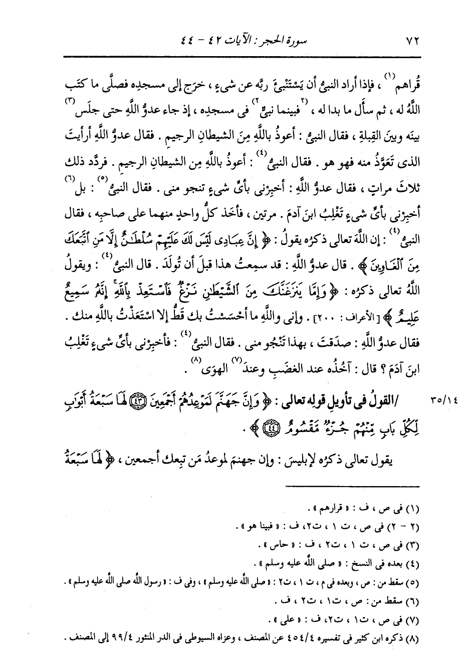 §الْقَوْلُ فِي تَأْوِيلِ قَوْلِهِ تَعَالَى: {وَإِنَّ جَهَنَّمَ لَمَوْعِدُهُمْ أَجْمَعِينَ. لَهَا سَبْعَةُ أَبْوَابٍ لِكُلِّ بَابٍ مِنْهُمْ جُزْءٌ مَّقْسُومٌ} [الحجر: 44] يَقُولُ تَعَالَى ذِكْرُهُ لِإِبْلِيسَ: وَإِنَّ جَهَنَّمَ لَمَوْعِدُ مَنْ تَبِعَكَ أَجْمَعِينَ {لَهَا سَبْعَةُ -[73]- أَبْوَابٍ} [الحجر: 44] يَقُولُ: لِجَهَنَّمَ سَبْعَةُ أَطْبَاقٍ، لِكُلِّ طَبَقٍ مِنْهُمْ: يَعْنِي مِنْ أَتْبَاعِ إِبْلِيسَ جُزْءٌ، يَعْنِي: قِسْمًا وَنَصِيبًا مَقْسُومًا. وَذُكِرَ أَنَّ أَبْوَابَ جَهَنَّمَ طَبَقَاتٌ بَعْضُهَا فَوْقَ بَعْضٍ