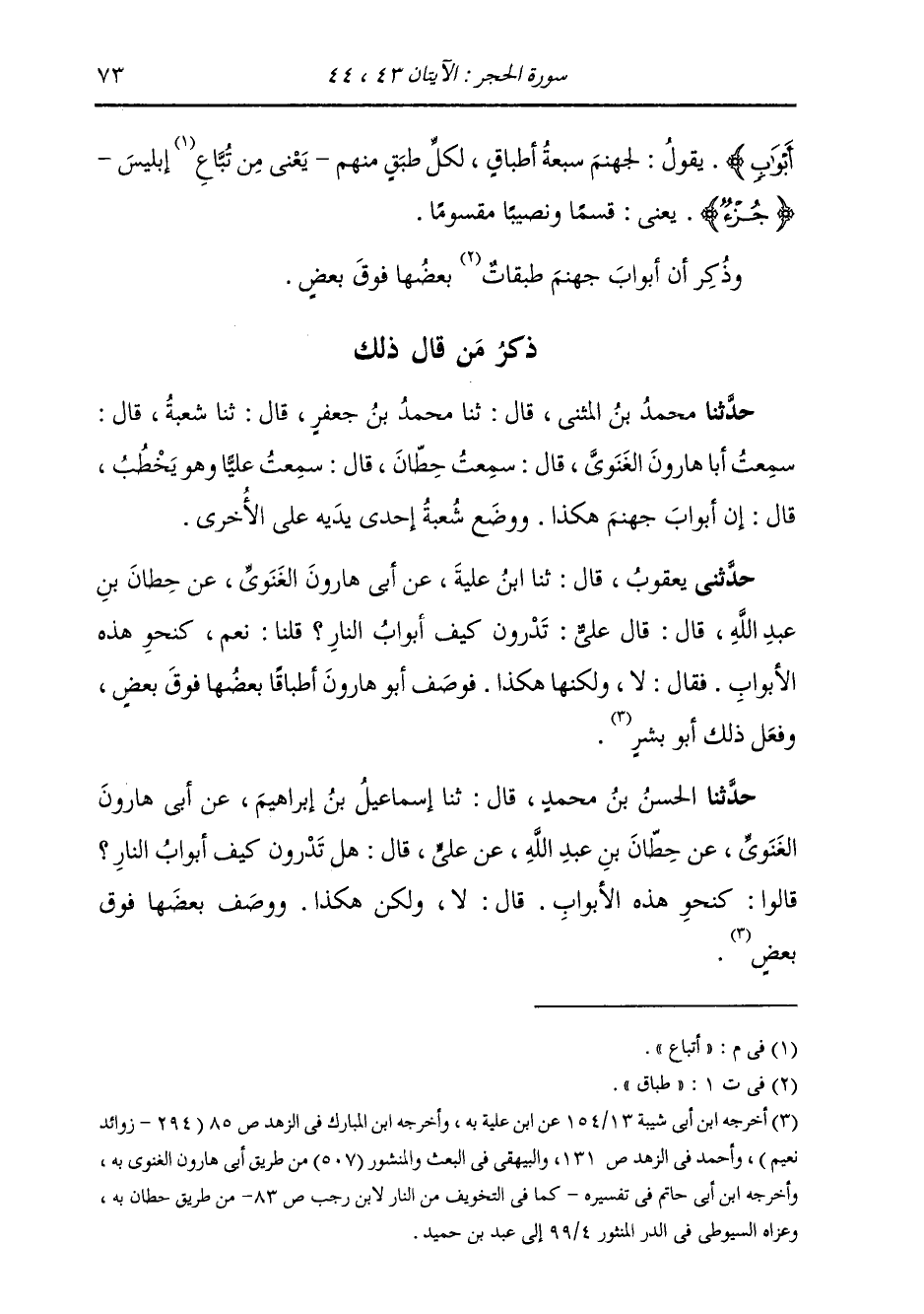 ذِكْرُ مَنْ قَالَ ذَلِكَ: حَدَّثَنَا مُحَمَّدُ بْنُ الْمُثَنَّى، قَالَ: ثنا مُحَمَّدُ بْنُ جَعْفَرٍ، قَالَ: ثنا شُعْبَةُ، قَالَ: سَمِعْتُ أَبَا هَارُونَ الْغَنَوِيَّ، قَالَ: سَمِعْتُ حِطَّانَ، قَالَ: سَمِعْتُ عَلِيًّا، وَهُوَ يَخْطُبُ، قَالَ: «إِنَّ §أَبْوَابَ جَهَنَّمَ هَكَذَا» وَوَضَعَ شُعْبَةُ إِحْدَى يَدَيْهِ عَلَى الْأُخْرَى "