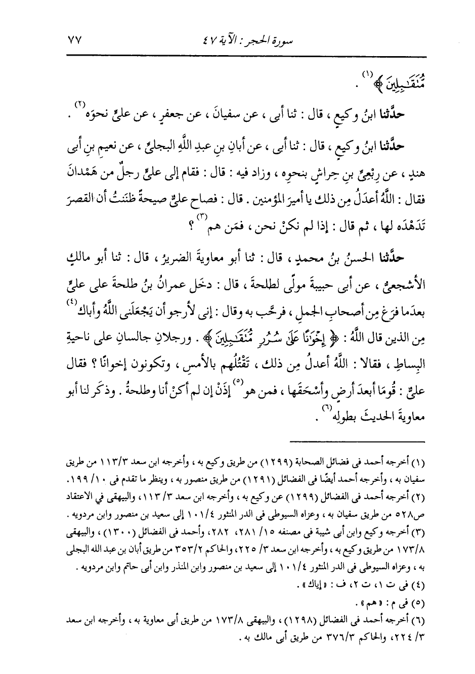 حَدَّثَنَا الْحَسَنُ بْنُ مُحَمَّدٍ، قَالَ: ثنا أَبُو مُعَاوِيَةَ الضَّرِيرُ، قَالَ: ثنا أَبُو مَالِكٍ الْأَشْجَعِيُّ، عَنْ أَبِي حَبِيبَةَ مَوْلًى لِطَلْحَةَ قَالَ: دَخَلَ عِمْرَانُ بْنُ طَلْحَةَ عَلَى عَلِيٍّ بَعْدَ مَا فَرَغَ مِنْ أَصْحَابِ الْجَمَلِ، فَرَحَّبَ بِهِ، وَقَالَ: " §إِنِّي لَأَرْجُو أَنْ يَجْعَلَنِي اللَّهُ وَأَبَاكَ مِنَ الَّذِينَ قَالَ اللَّهُ: {إِخْوَانًا عَلَى سُرُرٍ مُتَقَابِلِينَ} [الحجر: 47] وَرَجُلَانِ جَالِسَانِ عَلَى نَاحِيَةِ الْبِسَاطِ فَقَالَا: اللَّهُ أَعْدَلُ مِنْ ذَلِكَ، تَقْتُلْهُمْ بِالْأَمْسِ وَتَكُونُونَ إِخْوَانًا؟ فَقَالَ عَلِيٌّ: قُومَا أَبْعَدَ أَرْضٍ وَأَسْحَقَهَا فَمَنْ هُمْ إِذَنْ إِنْ لَمْ أَكُنْ أنا وَطَلْحَةُ؟ ". وَذَكَرَ لَنَا أَبُو مُعَاوِيَةَ الْحَدِيثَ بِطُولِهِ