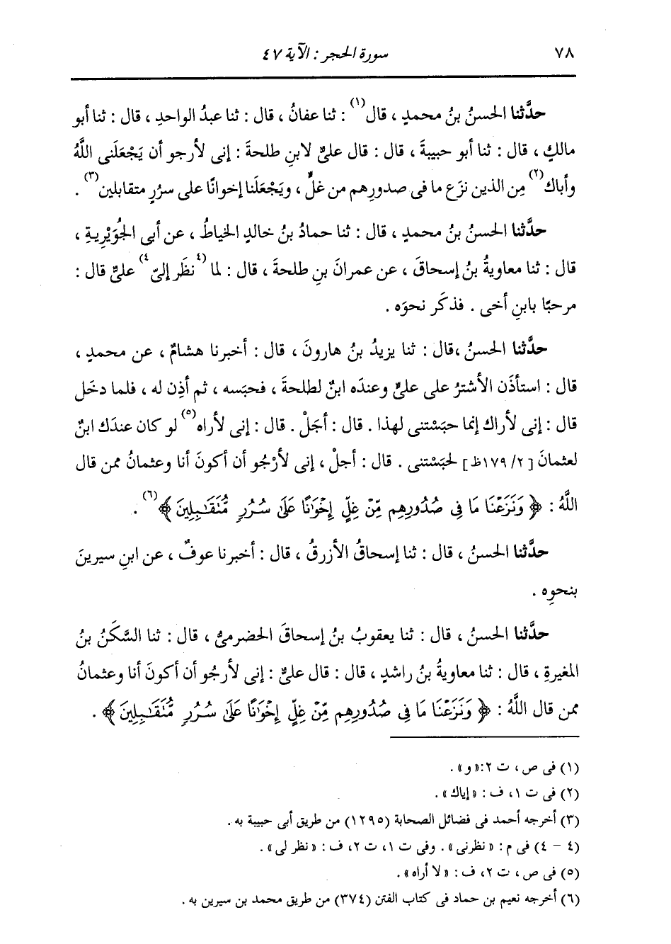 حَدَّثَنَا الْحَسَنُ، قَالَ: ثنا يَزِيدُ بْنُ هَارُونَ، قَالَ: أَخْبَرَنَا هِشَامٌ، عَنْ مُحَمَّدٍ، قَالَ: اسْتَأْذَنَ الْأَشْتَرُ عَلَى عَلِيٍّ وَعِنْدَهُ ابْنٌ لِطَلْحَةَ، فَحَبَسَهُ ثُمَّ أَذِنَ لَهُ، فَلَمَّا دَخَلَ قَالَ: إِنِّي لَأَرَاكَ إِنَّمَا حَبَسْتَنِي لِهَذَا قَالَ: «أَجَلْ» قَالَ: إِنِّي لَأَرَاهُ لَوْ كَانَ عِنْدَكَ ابْنٌ لِعُثْمَانَ لَحَبَسْتَنِي قَالَ: " أَجَلْ، §إِنِّي لَأَرْجُو أَنْ أَكُونَ أنا وَعُثْمَانُ مِمَّنْ قَالَ اللَّهُ: {وَنَزَعْنَا مَا فِي صُدُورِهِمْ مِنْ غِلٍّ إِخْوَانًا عَلَى سُرُرٍ مُتَقَابِلِينَ} [الحجر: 47] ". حَدَّثَنَا الْحَسَنُ قَالَ: ثنا إِسْحَاقُ الْأَزْرَقُ قَالَ: أَخْبَرَنَا عَوْفٌ، عَنْ ابْنِ سِيرِينَ، بِنَحْوِهِ
