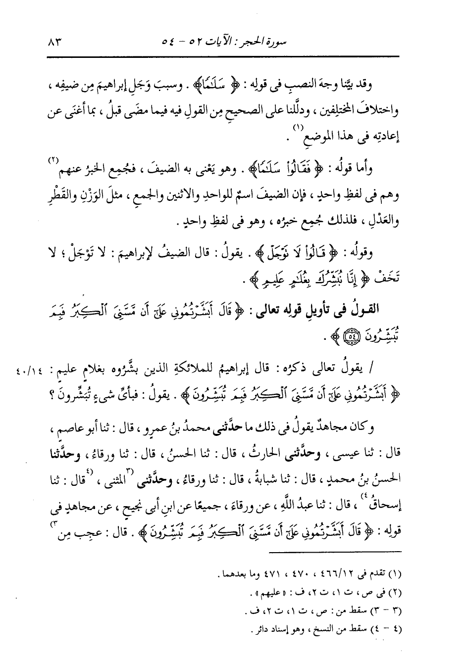حَدَّثَنِي مُحَمَّدُ بْنُ عَمْرٍو، قَالَ: ثنا أَبُو عَاصِمٍ، قَالَ: ثنا عِيسَى، وَحَدَّثَنِي الْحَرْثُ، قَالَ: ثنا الْحَسَنُ، قَالَ: ثنا وَرْقَاءُ، وَحَدَّثَنَا الْحَسَنُ بْنُ مُحَمَّدٍ، قَالَ: ثنا شَبَابَةُ، قَالَ: ثنا وَرْقَاءُ، وَحَدَّثَنِي الْمُثَنَّى، قَالَ: ثنا عَبْدُ اللَّهِ، عَنْ وَرْقَاءَ، جَمِيعًا، عَنِ ابْنِ أَبِي نَجِيحٍ، عَنْ مُجَاهِدٍ، فِي قَوْلِهِ: {§قَالَ أَبَشَّرْتُمُونِي عَلَى أَنْ مَسَّنِيَ الْكِبْرُ فَبِمَ تُبَشِّرُونَ} [الحجر: 54] قَالَ: «عَجِبَ مِنْ -[84]- كِبَرِهِ وَكِبَرِ امْرَأَتِهِ» . حَدَّثَنَا الْقَاسِمُ قَالَ: ثنا الْحُسَيْنُ قَالَ: ثني حَجَّاجٌ، عَنِ ابْنِ جُرَيْجٍ، عَنْ مُجَاهِدٍ، مِثْلَهُ. وَقَالَ {عَلَى أَنْ مَسَّنِيَ الْكِبَرُ} [الحجر: 54] وَمَعْنَاهُ: لِأَنْ مَسَّنِيَ الْكِبَرُ وَبِأَنْ مَسَّنِي الْكِبْرُ، وَهُوَ نَحْوَ قَوْلِهِ: {حَقِيقٌ عَلَى أَنْ لَا أَقُولَ عَلَى اللَّهِ إِلَّا الْحَقَّ} [الأعراف: 105] بِمَعْنَى: بِأَنْ لَا أَقُولَ، وَيُمَثِّلُهُ فِي الْكَلَامِ: أَتَيْتُكَ أَنَّكَ تُعْطِي، فَلَمْ أَجِدْكَ تُعْطِي