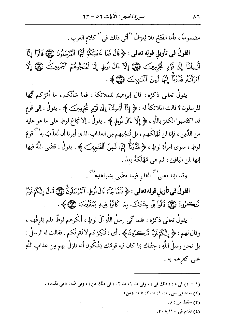 §الْقَوْلُ فِي تَأْوِيلِ قَوْلِهِ تَعَالَى: {قَالَ فَمَا خَطْبُكُمْ أَيُّهَا الْمُرْسَلُونَ. قَالُوا إِنَّا أُرْسِلْنَا إِلَى قَوْمٍ مُّجْرِمِينَ. إِلَّا آلَ لُوطٍ إِنَّا لَمُنَجُّوهُمْ أَجْمَعِينَ. إِلَّا امْرَأَتَهُ قَدَّرْنَا إِنَّهَا لَمِنَ الْغَابِرِينَ} [الحجر: 58] يَقُولُ تَعَالَى ذِكْرُهُ: قَالَ إِبْرَاهِيمُ لِلْمَلَائِكَةِ: فَمَا شَأْنُكُمْ؟ مَا أَمْرُكُمْ أَيُّهَا الْمُرْسَلُونَ؟ قَالَتِ الْمَلَائِكَةُ لَهُ: {إِنَّا أُرْسِلْنَا إِلَى قَوْمٍ مُجْرِمِينَ} [الحجر: 58] يَقُولُ: إِلَى قَوْمٍ قَدِ اكْتَسَبُوا الْكُفْرَ بِاللَّهِ. {إِلَّا آلَ لُوطٍ} [الحجر: 59] يَقُولُ: إِلَّا أَتْبَاعَ لُوطٍ عَلَى مَا هُوَ عَلَيْهِ مِنَ الدِّينِ، فَإِنَّا لَنْ نُهْلِكَهُمْ، بَلْ نُنْجِيهِمْ مِنَ الْعَذَابِ الَّذِي أُمِرْنَا أَنْ نُعَذِّبَ بِهِ قَوْمَ لُوطٍ. سِوَى امْرَأَةَ لُوطٍ {قَدَّرْنَا إِنَّهَا لَمِنَ الْغَابِرِينَ} [الحجر: 60] يَقُولُ: قَضَى اللَّهُ فِيهَا إِنَّهَا لَمِنَ الْبَاقِينَ، ثُمَّ هِيَ مُهْلَكَةٌ بَعْدُ، وَقَدْ بَيَّنَّا الْغَابِرَ فِيمَا مَضَى بِشَوَاهِدِهِ