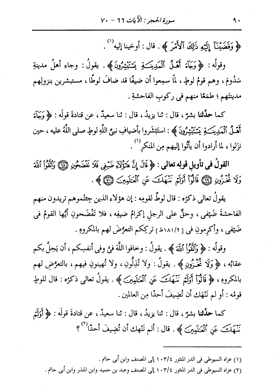 حَدَّثَنَا بِشْرٌ، قَالَ: ثنا يَزِيدُ، قَالَ: ثنا سَعِيدٌ، عَنْ قَتَادَةَ، قَوْلُهُ: {§وَجَاءَ أَهْلُ الْمَدِينَةِ يَسْتَبْشِرُونَ} [الحجر: 67] «اسْتَبْشَرُوا بِأَضْيَافِ نَبِيِّ اللَّهِ صَلَّى اللهُ عَلَيْهِ وَسَلَّمَ لُوطٍ حِينَ نَزَلُوا لِمَا أَرَادُوا أَنْ يَأْتُوا إِلَيْهِمْ مِنَ الْمُنْكَرِ»