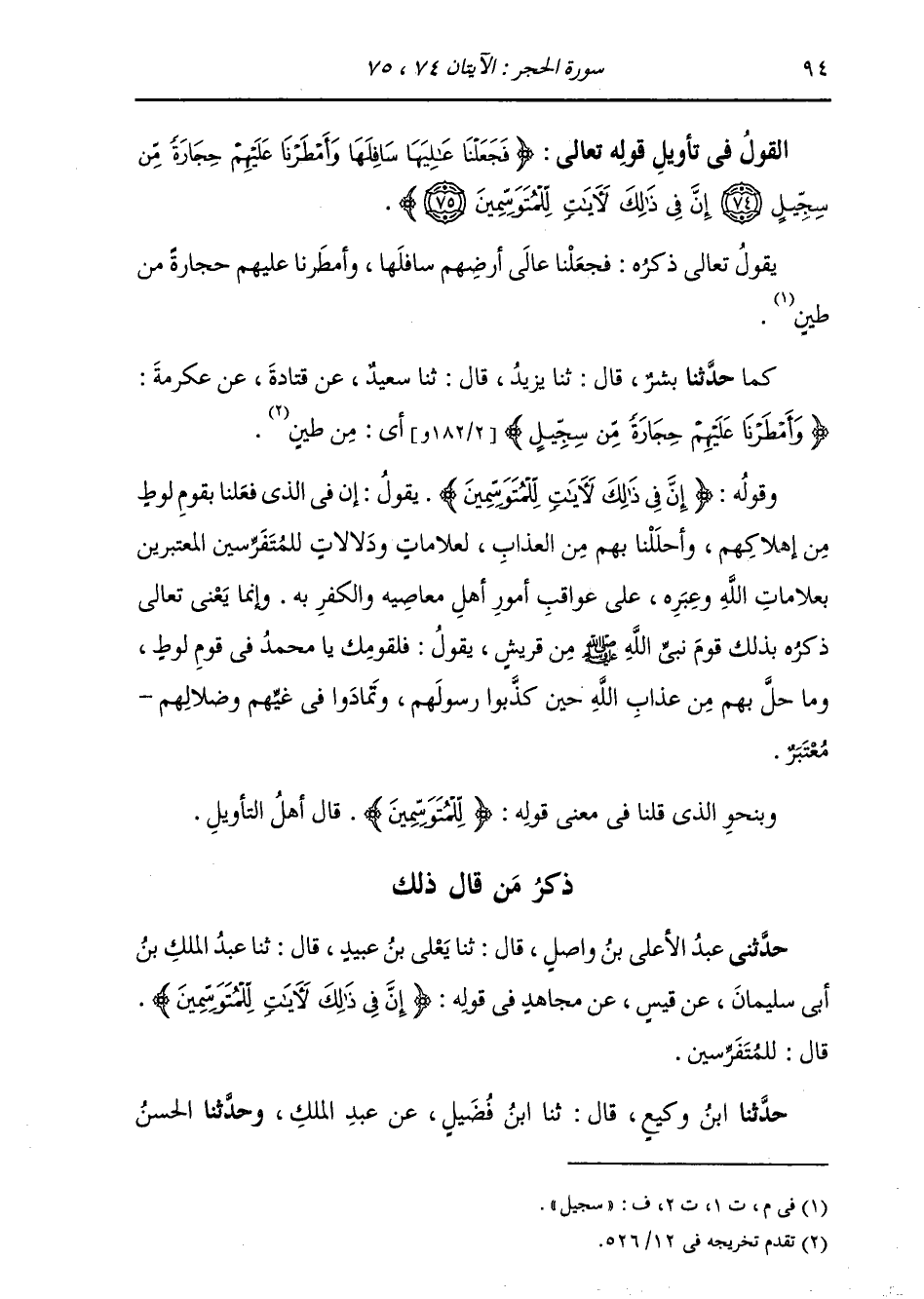 §الْقَوْلُ فِي تَأْوِيلِ قَوْلِهِ تَعَالَى: {فَجَعَلْنَا عَالِيَهَا سَافِلَهَا وَأَمْطَرْنَا عَلَيْهِمْ حِجَارَةً مِنْ سِجِّيلٍ. إِنَّ فِي ذَلِكَ لَآيَاتٍ لِلْمُتَوَسِّمِينَ} [الحجر: 75] يَقُولُ تَعَالَى ذِكْرُهُ: فَجَعَلْنَا عَالِيَ أَرْضِهِمْ سَافِلَهَا، وَأَمْطَرْنَا عَلَيْهِمْ حِجَارَةً مِنْ سِجِّيلٍ، كَمَا: