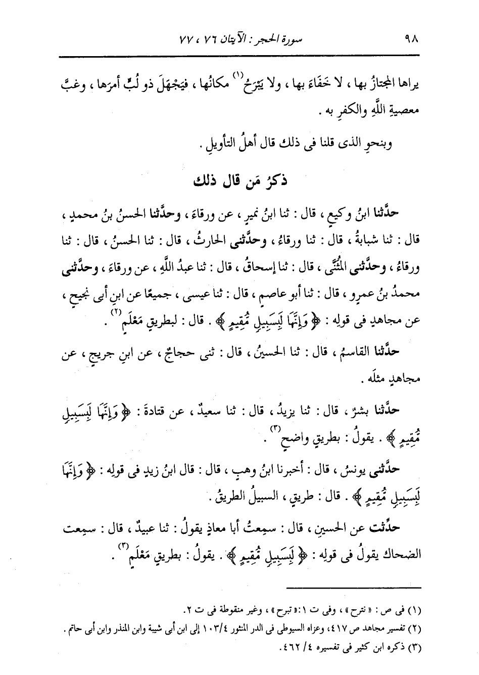 ذِكْرُ مَنْ قَالَ ذَلِكَ: حَدَّثَنَا ابْنُ وَكِيعٍ، قَالَ: ثنا ابْنُ نُمَيْرٍ، عَنْ وَرْقَاءَ، وَحَدَّثَنَا الْحَسَنُ بْنُ مُحَمَّدٍ، قَالَ: ثنا شَبَابَةُ، قَالَ: ثنا وَرْقَاءُ، وَحَدَّثَنِي الْحَارِثُ، قَالَ: ثنا الْحَسَنُ، قَالَ: ثنا وَرْقَاءُ، وَحَدَّثَنِي الْمُثَنَّى، قَالَ: ثنا إِسْحَاقُ، قَالَ: ثنا عَبْدُ اللَّهِ، عَنْ وَرْقَاءَ، وَحَدَّثَنِي مُحَمَّدُ بْنُ عَمْرٍو، قَالَ: ثنا أَبُو عَاصِمٍ، قَالَ: ثنا عِيسَى، جَمِيعًا عَنِ ابْنِ أَبِي نَجِيحٍ، عَنْ مُجَاهِدٍ، قَوْلُهُ: {§وَإنَّهَا لَبِسَبِيلٍ مُقِيمٍ} [الحجر: 76] قَالَ: «لَبِطَرِيقٍ مُعَلَّمٍ» . حَدَّثَنَا الْقَاسِمُ قَالَ: ثنا الْحُسَيْنُ قَالَ: ثني حَجَّاجٌ، عَنِ ابْنِ جُرَيْجٍ، عَنْ مُجَاهِدٍ، مِثْلَهُ
