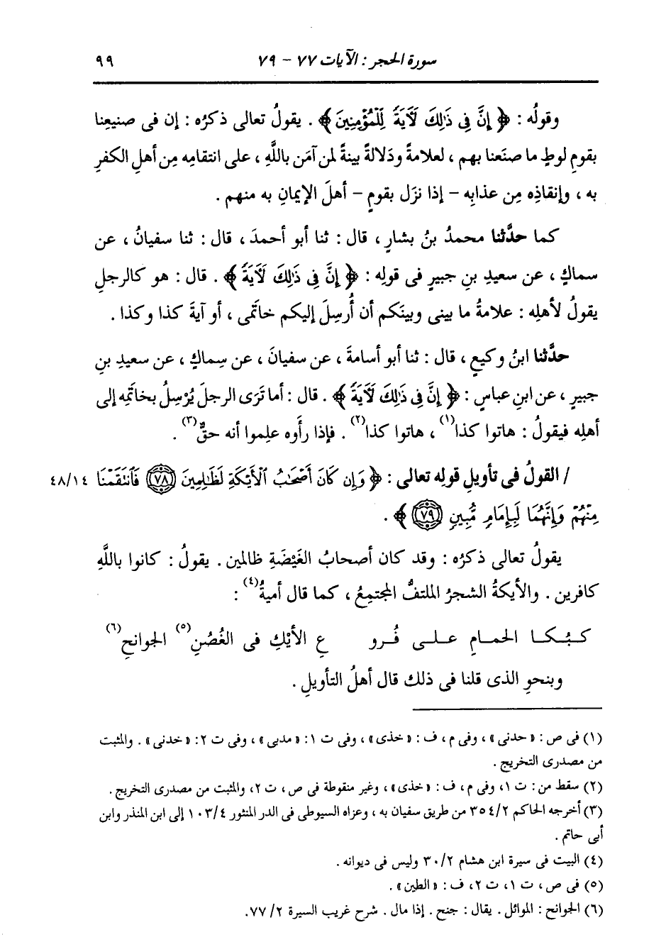 §وَقَوْلُهُ: {إِنَّ فِي ذَلِكَ لَآيَةً لِلْمُؤْمِنِينَ} [الحجر: 77] يَقُولُ تَعَالَى ذِكْرُهُ: إِنَّ فِي صَنِيعِنَا بِقَوْمِ لُوطٍ مَا صَنَعْنَا بِهِمْ، لَعَلَامَةٌ وَدَلَالَةٌ بَيِّنَةٌ لِمَنْ آمَنَ بِاللَّهِ عَلَى انْتِقَامِهِ مِنْ أَهْلِ الْكُفْرِ بِهِ، وَإِنْقَاذِهِ مِنْ عَذَابِهِ، إِذَا نَزَلَ بِقَوْمٍ أَهْلُ الْإِيمَانِ بِهِ مِنْهُمْ، كَمَا: