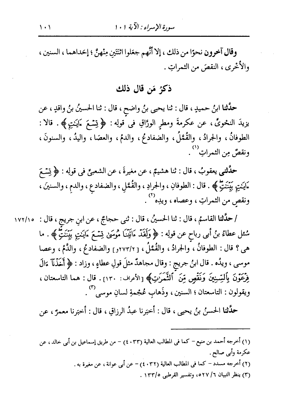 ذِكْرُ مَنْ قَالَ ذَلِكَ: حَدَّثَنَا ابْنُ حُمَيْدٍ، قَالَ: ثنا يَحْيَى بْنُ وَاضِحٍ، قَالَ: ثنا الْحُسَيْنُ بْنُ وَاقِدٍ، عَنْ يَزِيدَ النَّحْوِيِّ، عَنْ عِكْرِمَةَ، وَمَطَرٍ الْوَرَّاقِ، فِي قَوْلِهِ: {§تِسْعَ آيَاتٍ} [الإسراء: 101] قَالَا: الطُّوفَانُ، وَالْجَرَادُ، وَالْقُمَّلُ، وَالضَّفَادِعُ، وَالدَّمُ، وَالْعَصَا، وَالْيَدُ، وَالسُّنُونُ، وَنَقْصٌ مِنَ الثَّمَرَاتِ