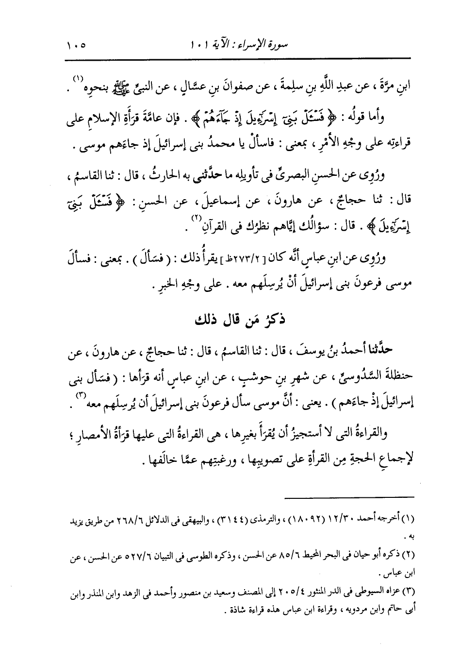 حَدَّثَنَا أَحْمَدُ بْنُ يُوسُفَ، قَالَ: ثنا الْقَاسِمُ، قَالَ: ثنا حَجَّاجٌ، عَنْ هَارُونَ، عَنْ حَنْظَلَةَ السَّدُوسِيِّ، عَنْ شَهْرِ بْنِ حَوْشَبٍ، عَنِ ابْنِ عَبَّاسٍ، أَنَّهُ قَرَأَ: «§فَسَأَلَ بَنِي إِسْرَائِيلَ إِذْ جَاءَهُمْ» يَعْنِي أَنَّ مُوسَى، سَأَلَ فِرْعَوْنَ بَنِي إِسْرَائِيلَ أَنْ يُرْسِلَهُمْ مَعَهُ وَالْقِرَاءَةُ الَّتِي لَا أَسْتَجِيزُ أَنْ يَقْرَأَ بِغَيْرِهَا، هِيَ الْقِرَاءَةُ الَّتِي عَلَيْهَا قُرَّاءُ الْأَمْصَارِ، لِإِجْمَاعِ الْحُجَّةِ مِنَ الْقُرَّاءِ عَلَى تَصْوِيبِهَا، وَرَغْبَتِهِمْ عَمَّا خَالَفَهُمْ