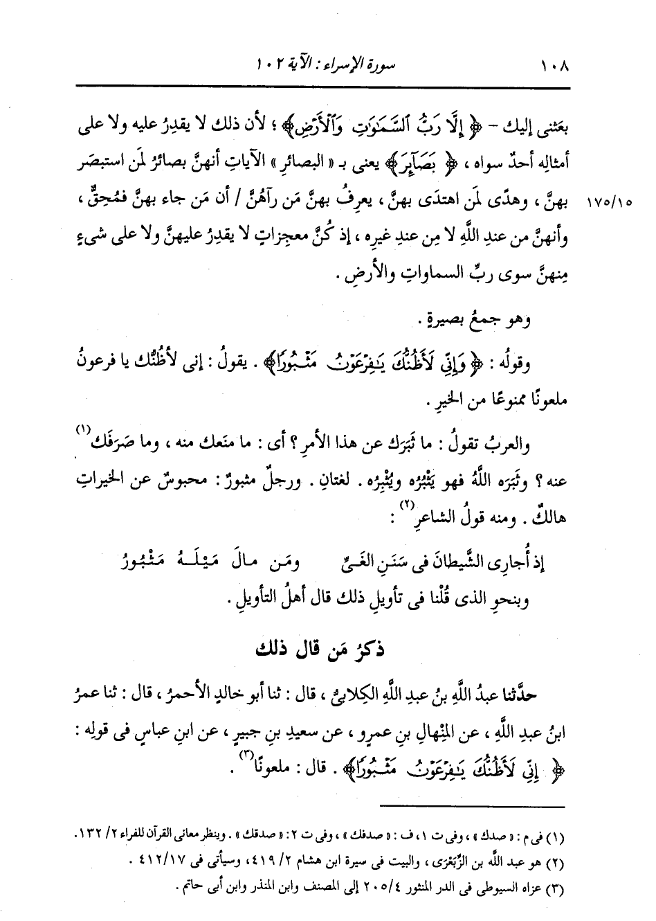 ذِكْرُ مَنْ قَالَ ذَلِكَ: حَدَّثَنَا عَبْدُ اللَّهِ بْنُ عَبْدِ اللَّهِ الْكِلَابِيُّ، قَالَ: ثنا أَبُو خَالِدٍ الْأَحْمَرُ، قَالَ: ثنا عُمَرُ بْنُ عَبْدِ اللَّهِ، عَنِ الْمِنْهَالِ بْنِ عَمْرٍو، عَنْ سَعِيدِ بْنِ جُبَيْرٍ، عَنِ ابْنِ عَبَّاسٍ، فِي قَوْلِهِ: {§إِنِّي لَأَظُنُّكَ يَا فِرْعَوْنُ مَثْبُورًا} [الإسراء: 102] قَالَ: مَلْعُونًا -[109]- حَدَّثَنَا أَبُو كُرَيْبٍ، قَالَ: ثنا مَرْوَانُ بْنُ مُعَاوِيَةَ، قَالَ: أَخْبَرَنَا عُمَرُ بْنُ عَبْدِ اللَّهِ الثَّقَفِيُّ، عَنِ الْمِنْهَالِ، عَنْ سَعِيدِ بْنِ جُبَيْرٍ، عَنِ ابْنِ عَبَّاسٍ، مِثْلَهُ
