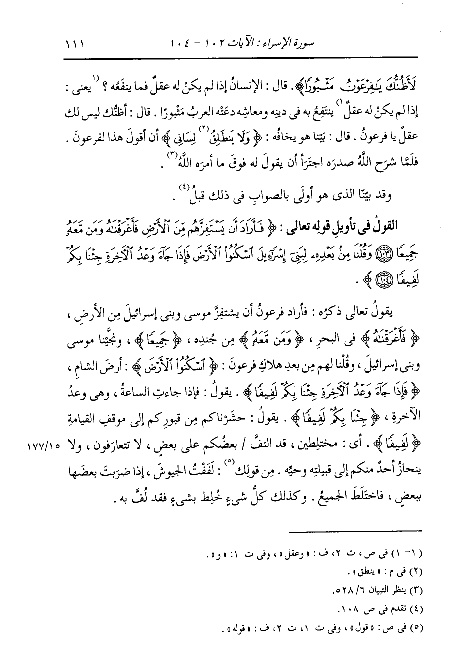 §الْقَوْلِ فِي تَأْوِيلِ قَوْلِهِ تَعَالَى: {فَأَرَادَ أَنْ يَسْتَفِزَّهُمْ مِنَ الْأَرْضِ فَأَغْرَقْنَاهُ وَمَنْ مَعَهُ جَمِيعًا وَقُلْنَا مِنْ بَعْدِهِ لِبَنِي إِسْرَائِيلَ اسْكُنُوا الْأَرْضَ فَإِذَا جَاءَ وَعْدُ الْآخِرَةِ جِئْنَا بِكُمْ لَفِيفًا} [الإسراء: 104] يَقُولُ تَعَالَى ذِكْرُهُ: فَأَرَادَ فِرْعَوْنُ أَنْ يَسْتَفِزَّ مُوسَى وَبَنِي إِسْرَائِيلَ مِنَ الْأَرْضِ {فَأَغْرَقْنَاهُ} [الإسراء: 103] فِي الْبَحْرِ {وَمَنْ مَعَهُ} [الأعراف: 131] مِنْ جُنْدِهِ {جَمِيعًا} [البقرة: 29] . وَنَجَّيْنَا مُوسَى وَبَنِي إِسْرَائِيلَ، وَقُلْنَا لَهُمْ مِنْ بَعْدِ هَلَاكِ فِرْعَوْنَ {اسْكُنُوا الْأَرْضَ} [الإسراء: 104] أَرْضَ الشَّامِ {فَإِذَا جَاءَ وَعْدُ الْآخِرَةِ جِئْنَا بِكُمْ لَفِيفًا} [الإسراء: 104] يَقُولُ: فَإِذَا جَاءَتِ السَّاعَةُ، وَهِيَ وَعْدُ الْآخِرَةِ، جِئْنَا بِكُمْ لَفِيفًا: يَقُولُ: حَشَرْنَاكُمْ مِنْ قُبُورِكُمْ إِلَى مَوْقِفِ الْقِيَامَةِ لَفِيفًا: أَيْ مُخْتَلِطِينَ قَدِ الْتَفَّ بَعْضُكُمْ عَلَى بَعْضٍ، لَا تَتَعَارَفُونَ، وَلَا يَنْحَازُ أَحَدٌ مِنْكُمْ إِلَى قَبِيلَتِهِ وَحَيِّهِ، مِنْ قَوْلِكَ: لَفَفْتُ الْجُيُوشَ: إِذَا ضَرَبْتُ بَعْضَهَا بِبَعْضٍ، فَاخْتَلَطَ الْجَمِيعُ، وَكَذَلِكَ كُلُّ شَيْءٍ خُلِطَ بِشَيْءٍ فَقَدْ لُفَّ بِهِ.