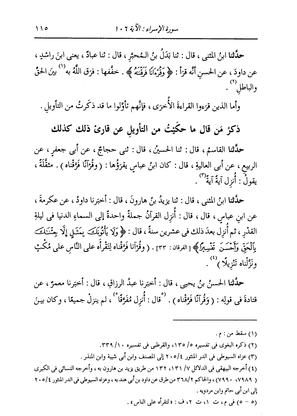 حَدَّثَنَا ابْنُ الْمُثَنَّى، قَالَ: ثنا بَدَلُ بْنُ الْمُحَبَّرِ، قَالَ: ثنا عَبَّادٌ، يَعْنِي ابْنَ رَاشِدٍ، عَنْ دَاوُدَ، عَنِ الْحَسَنِ، أَنَّهُ قَرَأَ: {§وَقُرْآنًا فَرَقْنَاهُ} [الإسراء: 106] خَفَّفَهَا: فَرَّقَ اللَّهُ بَيْنَ الْحَقِّ وَالْبَاطِلِ وَأَمَّا الَّذِينَ قَرَءُوا الْقِرَاءَةَ الْأُخْرَى، فَإِنَّهُمْ تَأَوَّلُوا مَا قَدْ ذَكَرْتُ مِنَ التَّأْوِيلِ