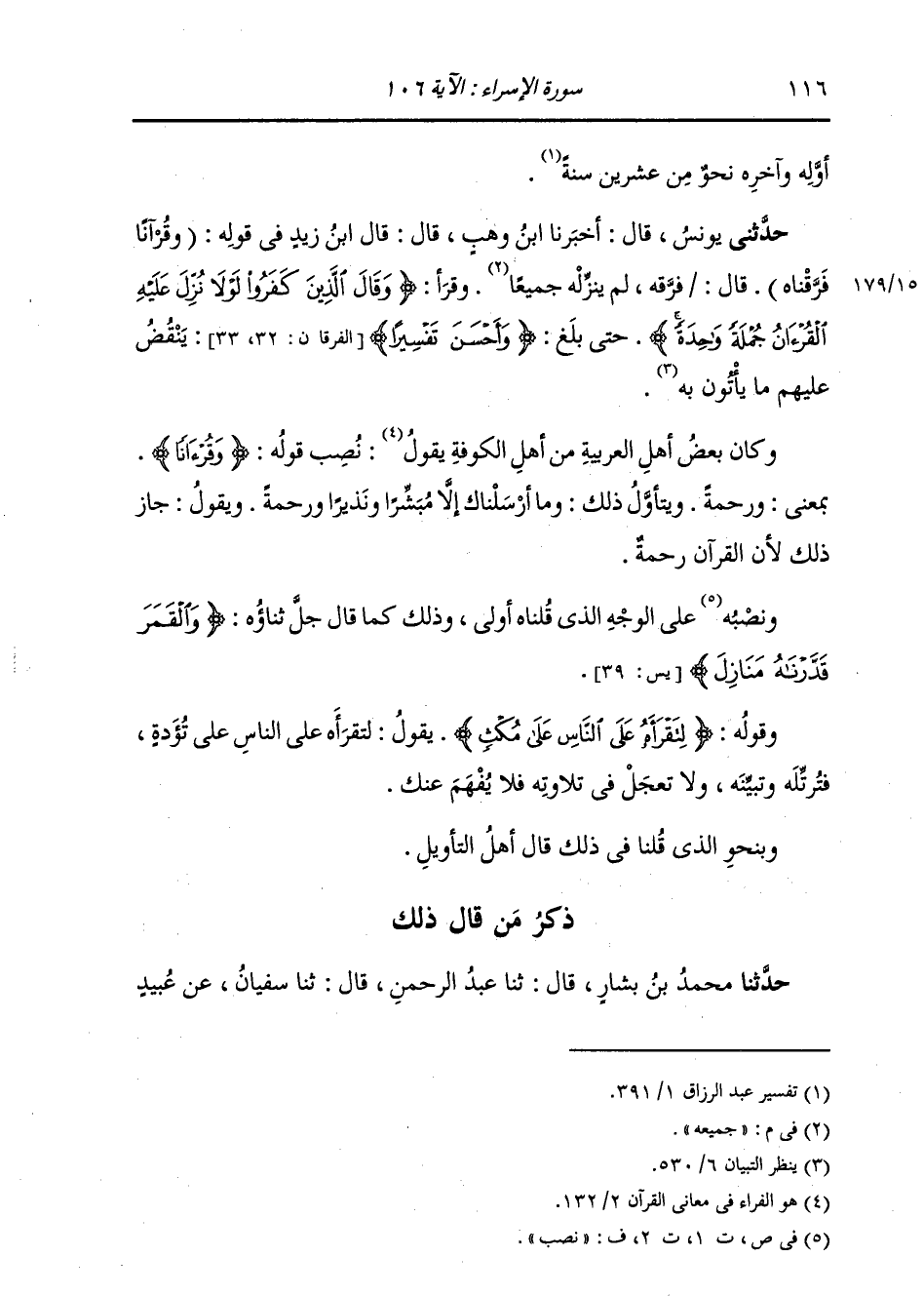 حَدَّثَنِي يُونُسُ، قَالَ: أَخْبَرَنَا ابْنُ وَهْبٍ، قَالَ: قَالَ ابْنُ زَيْدٍ، فِي قَوْلِهِ: «§وَقُرْآنًا فَرَّقْنَاهُ» قَالَ: فَرَّقَهُ: لَمْ يُنَزِّلْهُ جَمِيعَهُ. وَقَرَأَ: {وَقَالَ الَّذِينَ كَفَرُوا لَوْلَا نُزِّلَ عَلَيْهِ الْقُرْآنُ جُمْلَةً وَاحِدَةً} [الفرقان: 32] حَتَّى بَلَغَ {وَأَحْسَنَ تَفْسِيرًا} [الفرقان: 33] يَنْقُضُ عَلَيْهِمْ مَا يَأْتُونَ بِهِ وَكَانَ بَعْضُ أَهْلِ الْعَرَبِيَّةِ مِنْ أَهْلِ الْكُوفَةِ يَقُولُ: نُصِبَ قَوْلُهُ {وَقُرْآنًا} [الإسراء: 106] بِمَعْنَى: وَرَحْمَةً، وَيَتَأَوَّلُ ذَلِكَ: {وَمَا أَرْسَلْنَاكَ إِلَّا مُبَشِّرًا وَنَذِيرًا} [الإسراء: 105] وَرَحْمَةً، وَيَقُولُ: جَازَ ذَلِكَ، لِأَنَّ الْقُرْآنَ رَحْمَةٌ، وَنَصْبُهُ عَلَى الْوَجْهِ الَّذِي قُلْنَاهُ أَوْلَى، وَذَلِكَ كَمَا قَالَ جَلَّ ثَنَاؤُهُ: {وَالْقَمَرَ قَدَّرْنَاهُ مَنَازِلَ} [يس: 39] وَقَوْلُهُ: {لِتَقْرَأَهُ عَلَى النَّاسِ عَلَى مُكْثٍ} [الإسراء: 106] يَقُولُ: لِتَقْرَأَهُ عَلَى النَّاسِ عَلَى تُؤَدَةٍ، فَتُرَتِّلَهُ وَتُبَيِّنَهُ، وَلَا تَعْجَلْ فِي تِلَاوَتِهِ، فَلَا يُفْهَمْ عَنْكَ. وَبِنَحْوِ الَّذِي قُلْنَا فِي ذَلِكَ، قَالَ أَهْلُ التَّأْوِيلِ