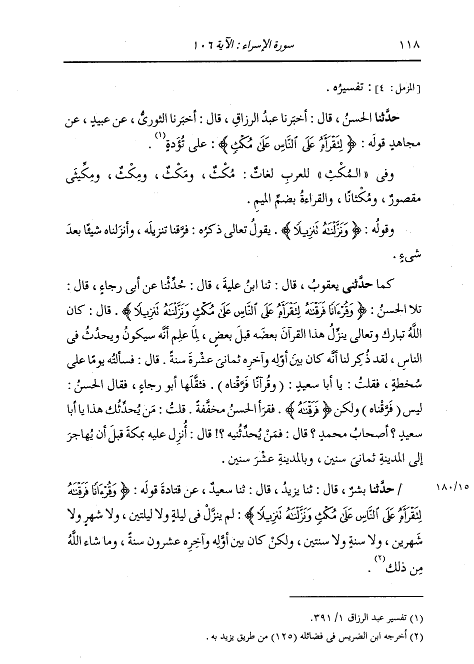 حَدَّثَنِي يَعْقُوبُ، قَالَ: ثنا ابْنُ عُلَيَّةَ، قَالَ: حَدَّثَنَا عَنْ أَبِي رَجَاءٍ، قَالَ: §تَلَا الْحَسَنُ: «وَقُرْآنًا فَرَّقْنَاهُ لِتَقْرَأَهُ عَلَى النَّاسِ عَلَى مُكْثٍ وَنَزَّلْنَاهُ تَنْزِيلًا» قَالَ: كَانَ اللَّهُ تَبَارَكَ وَتَعَالَى يُنَزِّلُ هَذَا الْقُرْآنَ بَعْضَهُ قَبْلَ بَعْضٍ لِمَا عَلِمَ أَنَّهُ سَيَكُونُ وَيَحْدُثُ فِي النَّاسِ، لَقَدْ ذُكِرَ لَنَا أَنَّهُ كَانَ بَيْنَ أَوَّلِهِ وَآخِرِهِ ثَمَانِيَ عَشْرَةَ سَنَةً، قَالَ: فَسَأَلْتُهُ يَوْمًا عَلَى سَخْطَةٍ، فَقُلْتُ: يَا أَبَا سَعِيدٍ «وَقُرْآنًا فَرَّقْنَاهُ» فَثَقَّلَهَا أَبُو رَجَاءٍ، فَقَالَ الْحَسَنُ: لَيْسَ فَرَّقْنَاهُ، وَلَكِنْ فَرَقْنَاهُ، فَقَرَأَ الْحَسَنُ مُخَفَّفَةً. قُلْتُ: مَنْ يُحَدِّثُكَ هَذَا يَا أَبَا سَعِيدٍ أَصْحَابُ مُحَمَّدٍ؟ قَالَ: فَمَنْ يُحَدِّثُنِيهِ قَالَ: أُنْزِلَ عَلَيْهِ بِمَكَّةَ قَبْلَ أَنْ يُهَاجِرَ إِلَى الْمَدِينَةِ ثَمَانِيَ سِنِينَ، وَبِالْمَدِينَةِ عَشْرَ سِنِينَ