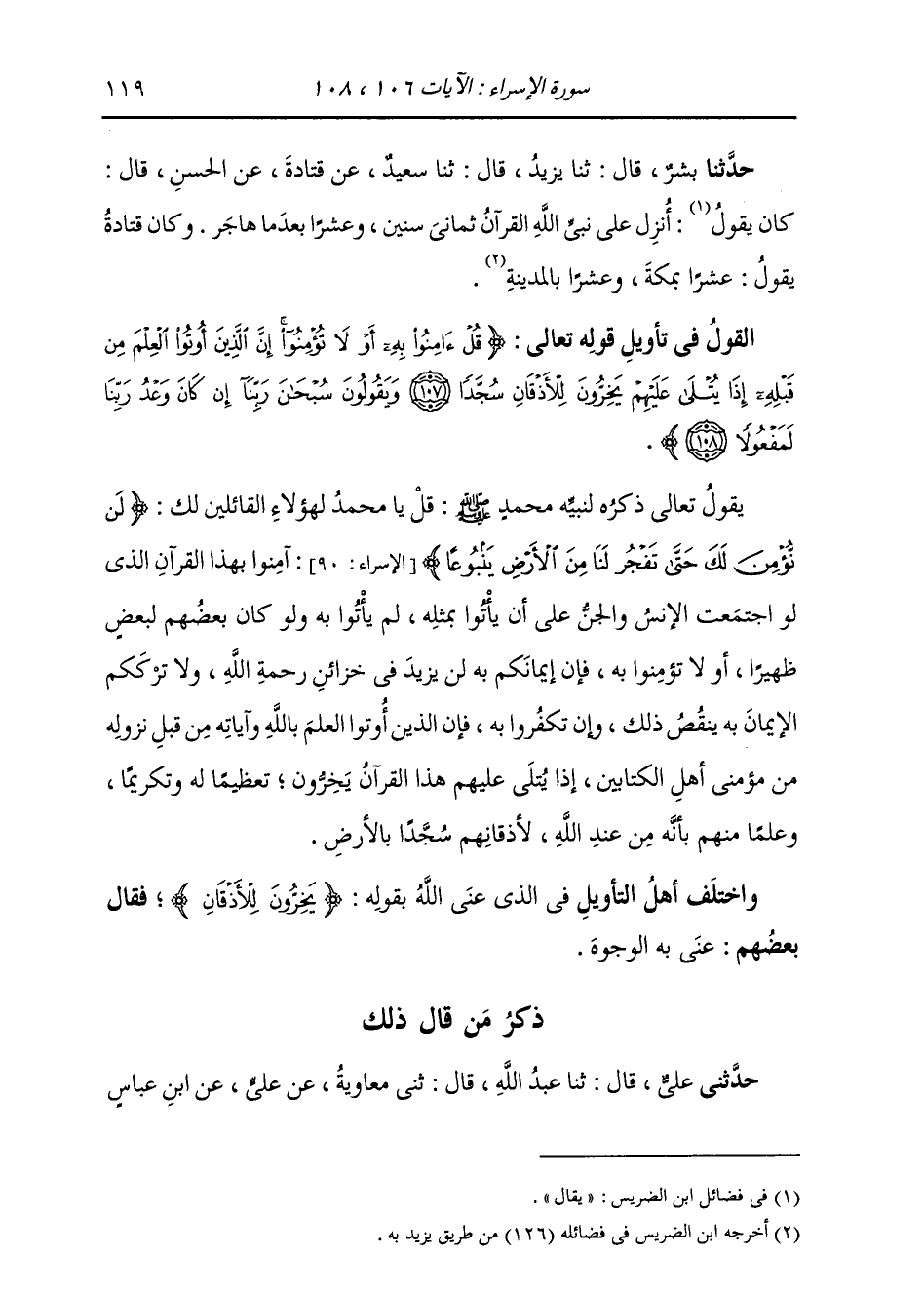 ذِكْرُ مَنْ قَالَ ذَلِكَ: حَدَّثَنِي عَلِيٌّ، قَالَ: ثنا عَبْدُ اللَّهِ، قَالَ: ثني مُعَاوِيَةُ، عَنْ عَلِيٍّ، عَنِ ابْنِ عَبَّاسٍ، -[120]- قَوْلُهُ: {§يَخِرُّونَ لِلْأَذْقَانِ سُجَّدًا} [الإسراء: 107] يَقُولُ: لِلْوُجُوهِ