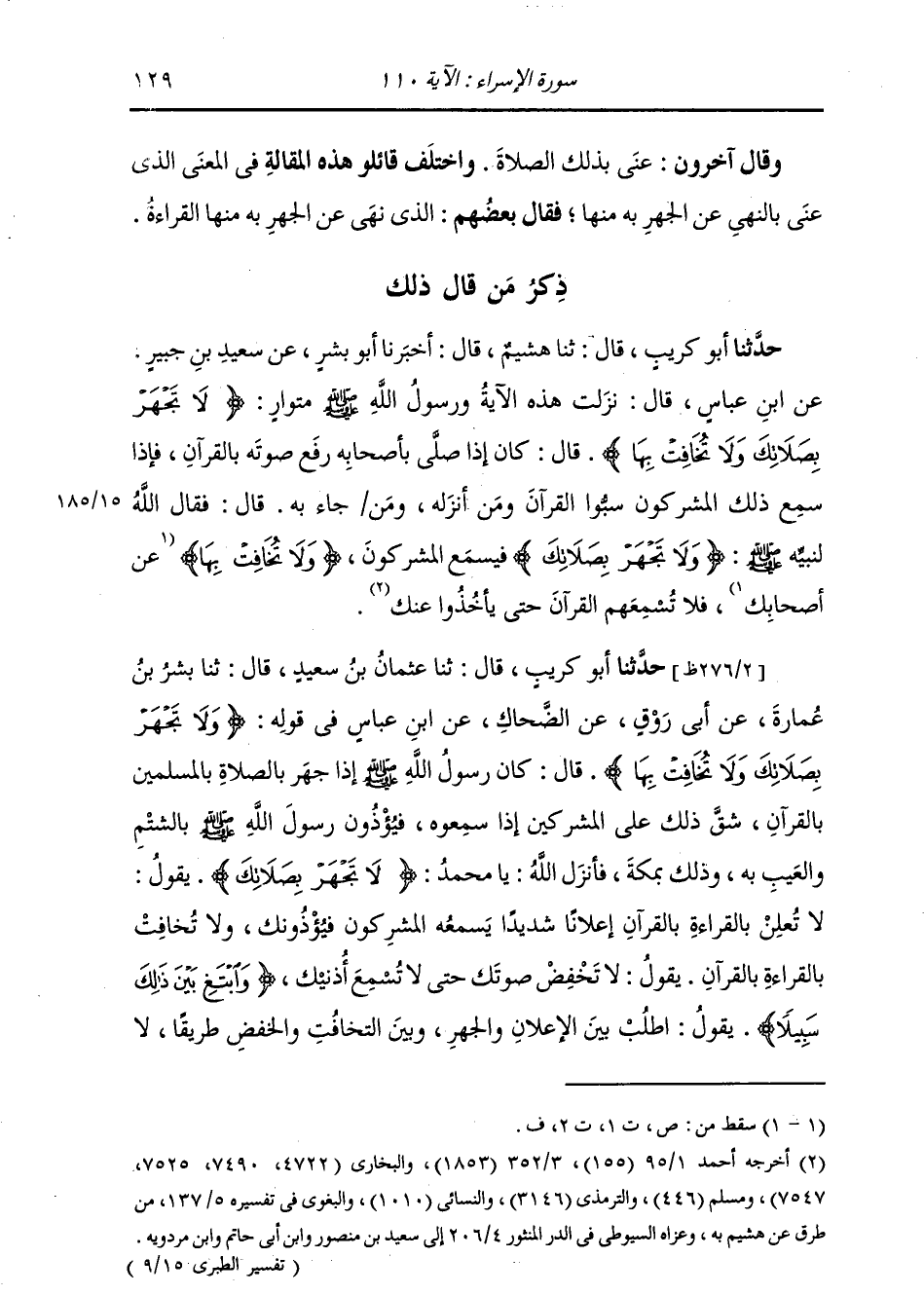 ذِكْرُ مَنْ قَالَ ذَلِكَ: حَدَّثَنَا أَبُو كُرَيْبٍ، قَالَ: ثنا هُشَيْمٌ، قَالَ: أَخْبَرَنَا أَبُو بِشْرٍ، عَنْ سَعِيدِ بْنِ جُبَيْرٍ، عَنِ ابْنِ عَبَّاسٍ، قَالَ: §نَزَلَتْ هَذِهِ الْآيَةُ وَرَسُولُ اللَّهِ صَلَّى اللهُ عَلَيْهِ وَسَلَّمَ مُتَوَارٍ {وَلَا تَجْهَرْ بِصَلَاتِكَ وَلَا تُخَافِتْ بِهَا} [الإسراء: 110] قَالَ: كَانَ إِذَا صَلَّى بِأَصْحَابِهِ رَفَعَ صَوْتَهُ بِالْقُرْآنِ، فَإِذَا سَمِعَ ذَلِكَ الْمُشْرِكُونَ سَبُّوا الْقُرْآنَ وَمَنْ أَنْزَلَهُ، وَمَنْ جَاءَ بِهِ، قَالَ: فَقَالَ اللَّهُ لِنَبِيِّهِ صَلَّى اللهُ عَلَيْهِ وَسَلَّمَ {وَلَا تَجْهَرْ بِصَلَاتِكَ} [الإسراء: 110] فَيَسْمَعُ الْمُشْرِكُونَ {وَلَا تُخَافِتْ بِهَا} [الإسراء: 110] عَنْ أَصْحَابِكَ، فَلَا تُسْمِعُهُمُ الْقُرْآنَ حَتَّى يَأْخُذُوا عَنْكَ