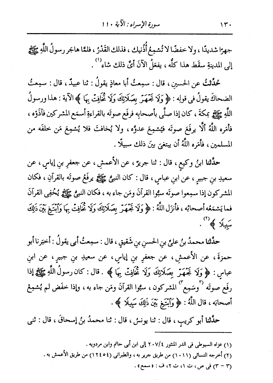 حَدَّثَنَا ابْنُ وَكِيعٍ، قَالَ: ثنا جَرِيرٌ، عَنِ الْأَعْمَشِ، عَنْ جَعْفَرِ بْنِ إِيَاسَ، عَنْ سَعِيدِ بْنِ جُبَيْرٍ، عَنِ ابْنِ عَبَّاسٍ، قَالَ: §كَانَ النَّبِيُّ صَلَّى اللهُ عَلَيْهِ وَسَلَّمَ يَرْفَعُ صَوْتَهُ بِالْقُرْآنِ، فَكَانَ الْمُشْرِكُونَ إِذَا سَمِعُوا صَوْتَهُ سَبُّوا الْقُرْآنَ، وَمَنْ جَاءَ بِهِ، فَكَانَ النَّبِيُّ صَلَّى اللهُ عَلَيْهِ وَسَلَّمَ يُخْفِي الْقُرْآنَ فَمَا يَسْمَعْهُ أَصْحَابُهُ، فَأَنْزَلَ اللَّهُ {وَلَا تَجْهَرْ بِصَلَاتِكَ وَلَا تُخَافِتْ بِهَا وَابْتَغِ بَيْنَ ذَلِكَ سَبِيلًا} [الإسراء: 110]