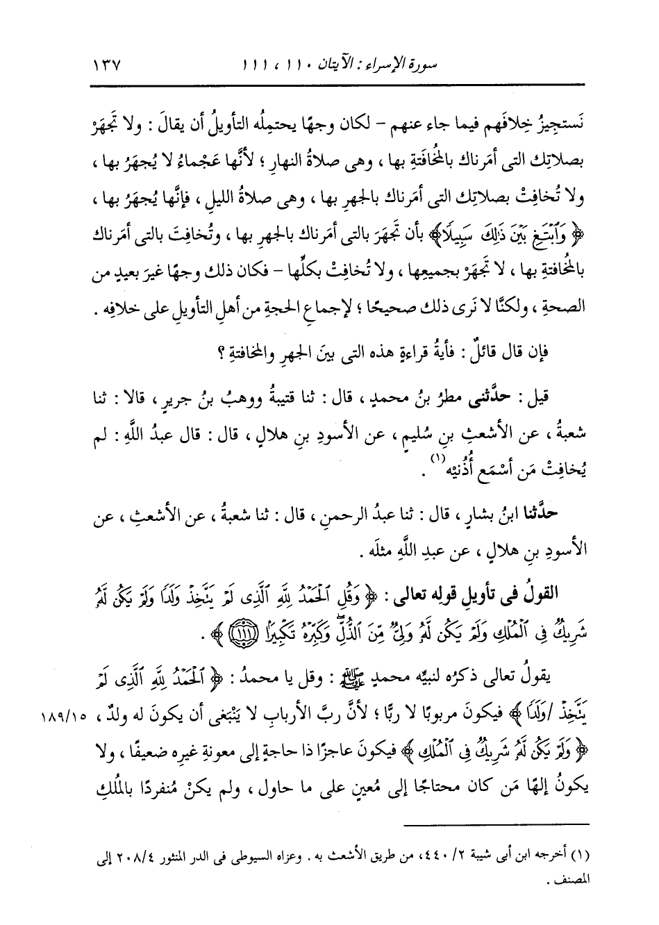 نَسْتَجِيرُ خِلَافَهُمْ فِيمَا جَاءَ عَنْهُمْ، لَكَانَ وَجْهًا يَحْتَمِلُهُ التَّأْوِيلُ أَنْ يُقَالَ: وَلَا تَجْهَرْ بِصَلَاتِكَ الَّتِي أَمَرْنَاكَ بِالْمُخَافَتَةِ بِهَا، وَهِيَ صَلَاةُ النَّهَارِ لِأَنَّهَا عَجْمَاءُ، لَا يُجْهَرُ بِهَا، وَلَا تُخَافِتْ بِصَلَاتِكَ الَّتِي أَمَرْنَاكَ بِالْجَهْرِ بِهَا، وَهِيَ صَلَاةُ اللَّيْلِ، فَإِنَّهَا يُجْهَرُ بِهَا {وَابْتَغِ بَيْنَ ذَلِكَ سَبِيلًا} [الإسراء: 110] بِأَنْ تَجْهَرَ بِالَّتِي أَمَرْنَاكَ بِالْجَهْرِ بِهَا، وَتُخَافِتْ بِالَّتِي أَمَرْنَاكَ بِالْمُخَافَتَةِ بِهَا، لَا تَجْهَرْ بِجَمِيعِهَا، وَلَا تُخَافِتْ بِكُلِّهَا، فَكَانَ ذَلِكَ وَجْهًا غَيْرَ بَعِيدٍ مِنَ الصِّحَّةِ، وَلَكِنَّا لَا نَرَى ذَلِكَ صَحِيحًا لِإِجْمَاعِ الْحُجَّةِ مِنْ أَهْلِ التَّأْوِيلِ عَلَى خِلَافِهِ. فَإِنْ قَالَ قَائِلٌ: فَأَيُّةُ قِرَاءَةِ هَذِهِ الَّتِي بَيْنَ الْجَهْرِ وَالْمُخَافَتَةِ؟ قِيلَ: