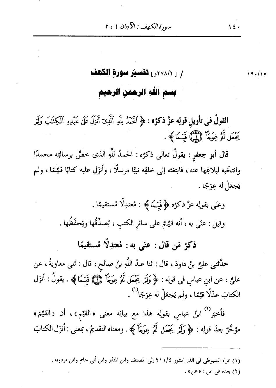 ذِكْرُ مَنْ قَالَ: عَنَى بِهِ مُعْتَدِلًا مُسْتَقِيمًا: حَدَّثَنِي عَلِيُّ بْنُ دَاوُدَ، قَالَ: ثنا عَبْدُ اللَّهِ بْنُ صَالِحٍ، قَالَ: ثني مُعَاوِيَةُ، عَنْ عَلِيٍّ، عَنِ ابْنِ عَبَّاسٍ، فِي قَوْلِهِ: {§وَلَمْ يَجْعَلْ لَهُ عِوَجًا قَيِّمًا} [الكهف: 2] يَقُولُ: أَنْزَلَ الْكِتَابَ عَدْلًا قَيِّمًا، وَلَمْ يَجْعَلْ لَهُ عِوَجًا فَأَخْبَرَ ابْنُ عَبَّاسٍ بِقَوْلِهِ هَذَا مَعَ بَيَانِهِ مَعْنَى الْقَيِّمِ أَنَّ الْقَيِّمَ مُؤَخَّرٌ بَعْدَ قَوْلِهِ، وَلَمْ يَجْعَلْ لَهُ عِوَجًا، وَمَعْنَاهُ التَّقْدِيمُ بِمَعْنَى: أَنْزَلَ الْكِتَابَ -[141]- عَلَى عَبْدِهِ قَيِّمًا