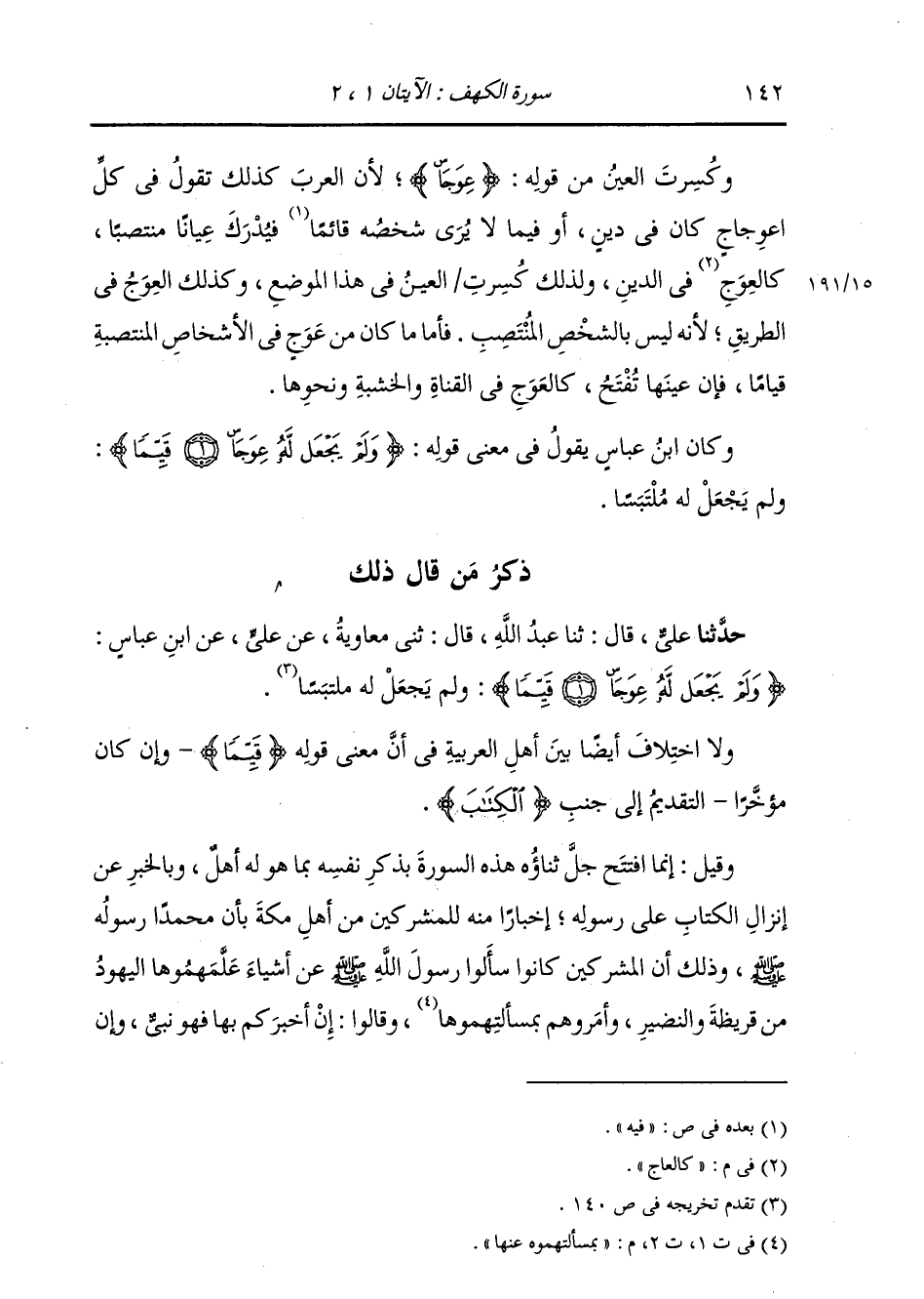 ذِكْرُ مَنْ قَالَ ذَلِكَ: حَدَّثَنَا عَلِيٌّ، قَالَ: ثنا عَبْدُ اللَّهِ، قَالَ: ثني مُعَاوِيَةُ، عَنْ عَلِيٍّ، عَنِ ابْنِ عَبَّاسٍ، {§وَلَمْ يَجْعَلْ لَهُ عِوَجًا قَيِّمًا} [الكهف: 2] وَلَمْ يَجْعَلْ لَهُ مُلْتَبَسًا وَلَا خِلَافَ أَيْضًا بَيْنَ أَهْلِ الْعَرَبِيَّةِ فِي أَنَّ مَعْنَى قَوْلِهِ {قَيِّمًا} [الأنعام: 161] وَإِنْ كَانَ مُؤَخَّرًا، التَّقْدِيمُ إِلَى جَنْبِ الْكِتَابِ. وَقِيلَ: إِنَّمَا افْتَتَحَ جَلَّ ثَنَاؤُهُ هَذِهِ السُّورَةَ بِذِكْرِ نَفْسِهِ بِمَا هُوَ لَهُ أَهْلٌ، وَبِالْخَبَرِ عَنْ إِنْزَالِ كِتَابِهِ عَلَى رَسُولِهِ أَخْبَارًا مِنْهُ لِلْمُشْرِكِينَ مِنْ أَهْلِ مَكَّةَ، بِأَنَّ مُحَمَّدًا رَسُولُهُ صَلَّى اللهُ عَلَيْهِ وَسَلَّمَ، وَذَلِكَ أَنَّ الْمُشْرِكِينَ كَانُوا سَأَلُوا رَسُولَ اللَّهِ صَلَّى اللهُ عَلَيْهِ وَسَلَّمَ عَنْ أَشْيَاءَ عَلَّمَهُمُوهَا الْيَهُودُ مِنْ قُرَيْظَةَ وَالنَّضِيرِ، وَأَمَرُوهُمْ بِمَسْأَلَتِهِمُوهُ عَنْهَا، وَقَالُوا: إِنْ أَخْبَرَكُمْ بِهَا فَهُوَ نَبِيُّ، وَإِنْ -[143]- لَمْ يُخْبِرْكُمْ بِهَا فَهُوَ مُتَقَوِّلٌ، فَوَعَدَهُمْ رَسُولُ اللَّهِ صَلَّى اللهُ عَلَيْهِ وَسَلَّمَ لِلْجَوَابِ عَنْهَا مَوْعِدًا، فَأَبْطَأَ الْوَحْيُ عَنْهُ بَعْضَ الْإِبْطَاءِ، وَتَأَخَّرَ مَجِيءُ جَبْرَائِيلُ عَلَيْهِ السَّلَامُ عَنْهُ عَنْ مِيعَادِهِ الْقَوْمَ، فَتَحَدَّثَ الْمُشْرِكُونَ بِأَنَّهُ أَخْلَفَهُمْ مَوْعِدَهُ، وَأَنَّهُ مُتَقَوِّلٌ، فَأَنْزَلَ اللَّهُ هَذِهِ السُّورَةَ جَوَابًا عَنْ مَسَائِلِهِمْ، وَافْتَتَحَ أَوَّلَهَا بِذِكْرِهِ، وَتَكْذِيبِ الْمُشْرِكِينَ فِي أُحْدُوثَتِهِمُ الَّتِي تَحَدَّثُوهَا بَيْنَهُمْ