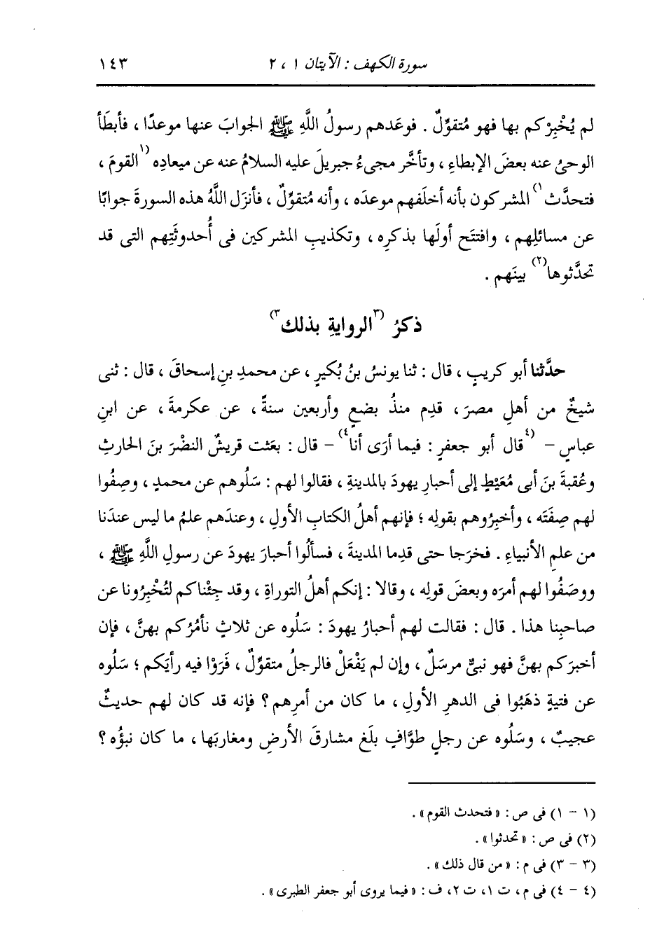 ذِكْرُ مَنْ قَالَ ذَلِكَ: حَدَّثَنَا أَبُو كُرَيْبٍ، قَالَ: ثنا يُونُسُ بْنُ بُكَيْرٍ، عَنْ مُحَمَّدِ بْنِ إِسْحَاقَ، قَالَ: ثني شَيْخٌ مِنْ أَهْلِ مِصْرَ، قَدِمَ مُنْذُ بِضْعٍ وَأَرْبَعِينَ سَنَةً، عَنْ عِكْرِمَةَ، عَنِ ابْنِ عَبَّاسِ فِيمَا يَرْوِي أَبُو جَعْفَرٍ الطَّبَرِيُّ قَالَ: بَعَثَتْ قُرَيْشٌ النَّضْرَ بْنَ الْحَارِثِ، وَعُقْبَةَ بْنَ أَبِي مُعَيْطٍ إِلَى أَحْبَارِ يَهُودَ بِالْمَدِينَةِ، فَقَالُوا لَهُمْ: سَلُوهُمْ عَنْ مُحَمَّدٍ، وَصِفُوا لَهُمْ صِفَتَهُ، وَأَخْبِرُوهُمْ بِقَوْلِهِ، فَإِنَّهُمْ أَهْلُ الْكِتَابِ الْأَوَّلِ، وَعِنْدَهُمْ عِلْمُ مَا لَيْسَ عِنْدَنَا مِنْ عِلْمِ الْأَنْبِيَاءِ. فَخَرَجَا حَتَّى قَدِمَا الْمَدِينَةَ، فَسَأَلُوا أَحْبَارَ يَهُودَ عَنْ رَسُولِ اللَّهِ صَلَّى اللهُ عَلَيْهِ وَسَلَّمَ، وَوَصَفُوا لَهُمْ أَمْرَهُ وَبَعْضَ قَوْلِهِ، وَقَالَا: إِنَّكُمْ أَهْلُ التَّوْرَاةِ، وَقَدْ جِئْنَاكُمْ لِتُخْبِرُونَا عَنْ صَاحِبَنَا هَذَا، قَالَ: فَقَالَتْ لَهُمْ أَحْبَارُ يَهُودَ: §سَلُوهُ عَنْ ثَلَاثٍ نَأْمُرُكُمْ بِهِنَّ، فَإِنْ أَخْبَرَكُمْ بِهِنَّ فَهُوَ نَبِيُّ مُرْسَلٌ، وَإِنْ لَمْ يَفْعَلْ فَالرَّجُلُ مُتَقَوِّلٌ، فَرُوا فِيهِ رَأْيَكُمْ: سَلُوهُ عَنْ فِتْيَةٍ ذَهَبُوا فِي الدَّهْرِ الْأَوَّلِ، مَا كَانَ مِنْ أَمْرِهِمْ فَإِنَّهُ قَدْ كَانَ لَهُمْ حَدِيثٌ عَجِيبٌ. وَسَلُوهُ عَنْ رَجُلٍ طَوَّافٍ، بَلَغَ مَشَارِقَ الْأَرْضِ وَمَغَارِبَهَا، مَا كَانَ نَبَؤُهُ؟ -[144]- وَسَلُوهُ عَنِ الرُّوحِ مَا هُوَ؟ فَإِنْ أَخْبِرَكُمْ بِذَلِكَ، فَإِنَّهُ نَبِيُّ فَاتَّبِعُوهُ، وَإِنْ هُوَ لَمْ يُخْبِرْكُمْ، فَهُوَ رَجُلٌ مُتَقَوِّلٌ، فَاصْنَعُوا فِي أَمْرِهِ مَا بَدَا لَكُمْ. فَأَقْبَلَ النَّضْرُ وَعُقْبَةُ حَتَّى قَدِمَا مَكَّةَ عَلَى قُرَيْشٍ، فَقَالَا: يَا مَعْشَرَ قُرَيْشٍ: قَدْ جِئْنَاكُمْ بِفَصْلِ مَا بَيْنَكُمْ وَبَيْنَ مُحَمَّدٍ، قَدْ أَمَرَنَا أَحْبَارُ يَهُودَ أَنْ نَسْأَلَهُ، عَنْ أُمُورٍ، فَأَخْبَرُوهُمْ بِهَا، فَجَاءُوا رَسُولَ اللَّهِ صَلَّى اللهُ عَلَيْهِ وَسَلَّمَ، فَقَالُوا: يَا مُحَمَّدُ أَخْبِرْنَا، فَسَأَلُوهُ عَمَّا أَمَرُوهُمْ بِهِ، فَقَالَ لَهُمْ رَسُولُ اللَّهِ صَلَّى اللهُ عَلَيْهِ وَسَلَّمَ: «أُخْبِرُكُمْ غَدًا بِمَا سَأَلْتُمْ عَنْهُ» وَلَمْ يَسْتَثْنِ فَانْصَرَفُوا عَنْهُ، فَمَكَثَ رَسُولُ اللَّهِ صَلَّى اللهُ عَلَيْهِ وَسَلَّمَ خَمْسَ عَشْرَةَ لَيْلَةً، لَا يُحْدِثُ اللَّهُ إِلَيْهِ فِي ذَلِكَ وَحْيًا، وَلَا يَأْتِيهِ جَبْرَائِيلُ عَلَيْهِ السَّلَامُ، حَتَّى أَرْجَفَ أَهْلُ مَكَّةَ، وَقَالُوا: وَعَدَنَا مُحَمَّدٌ غَدًا، وَالْيَوْمَ خَمْسَ عَشْرَةَ قَدْ أَصْبَحْنَا فِيهَا لَا يُخْبِرُنَا بِشَيْءٍ مِمَّا سَأَلْنَاهُ عَنْهُ. وَحَتَّى أَحْزَنَ رَسُولُ اللَّهِ صَلَّى اللهُ عَلَيْهِ وَسَلَّمَ مُكْثَ الْوَحْيِ عَنْهُ، وَشَقَّ عَلَيْهِ مَا يَتَكَلَّمُ بِهِ أَهْلُ مَكَّةَ. ثُمَّ جَاءَهُ جَبْرَائِيلُ عَلَيْهِ السَّلَامُ، مِنَ اللَّهِ عَزَّ وَجَلَّ، بِسُورَةِ أَصْحَابِ الْكَهْفِ، فِيهَا مُعَاتَبَتُهُ إِيَّاهُ عَلَى حُزْنِهِ عَلَيْهِمْ وَخَبَرُ مَا سَأَلُوهُ عَنْهُ مِنْ أَمْرِ الْفِتْيَةِ وَالرَّجُلُ الطَّوَافُ، وَقَوْلُ اللَّهِ عَزَّ وَجَلَّ {وَيَسْأَلُونَكَ عَنِ الرُّوحِ قُلِ الرُّوحُ مِنْ أَمْرِ رَبِّي وَمَا أُوتِيتُمْ مِنَ الْعِلْمِ إِلَّا قَلِيلًا} [الإسراء: 85] قَالَ ابْنُ إِسْحَاقَ: فَبَلَغَنِي أَنَّ رَسُولَ اللَّهِ صَلَّى اللهُ عَلَيْهِ وَسَلَّمَ افْتَتَحَ السُّورَةَ فَقَالَ {الْحَمْدُ لِلَّهِ الَّذِي أَنْزَلَ عَلَى عَبْدِهِ الْكِتَابَ} [الكهف: 1] يَعْنِي مُحَمَّدًا أَنَّكَ رَسُولِي فِي تَحْقِيقِ مَا سَأَلُوا ع
