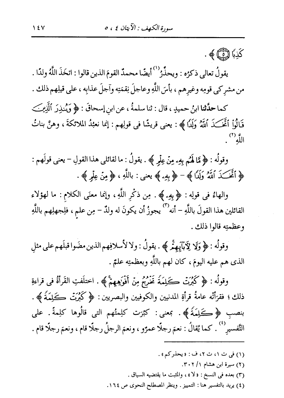 حَدَّثَنَا ابْنُ حُمَيْدٍ، قَالَ: ثنا سَلَمَةُ، عَنِ ابْنِ إِسْحَاقَ، {§وَيُنْذِرَ الَّذِينَ قَالُوا اتَّخَذَ اللَّهُ وَلَدًا} [الكهف: 4] يَعْنِي قُرَيْشًا فِي قَوْلِهِمْ: إِنَّمَا نَعْبُدُ الْمَلَائِكَةَ، وَهُنَّ بَنَاتُ اللَّهِ