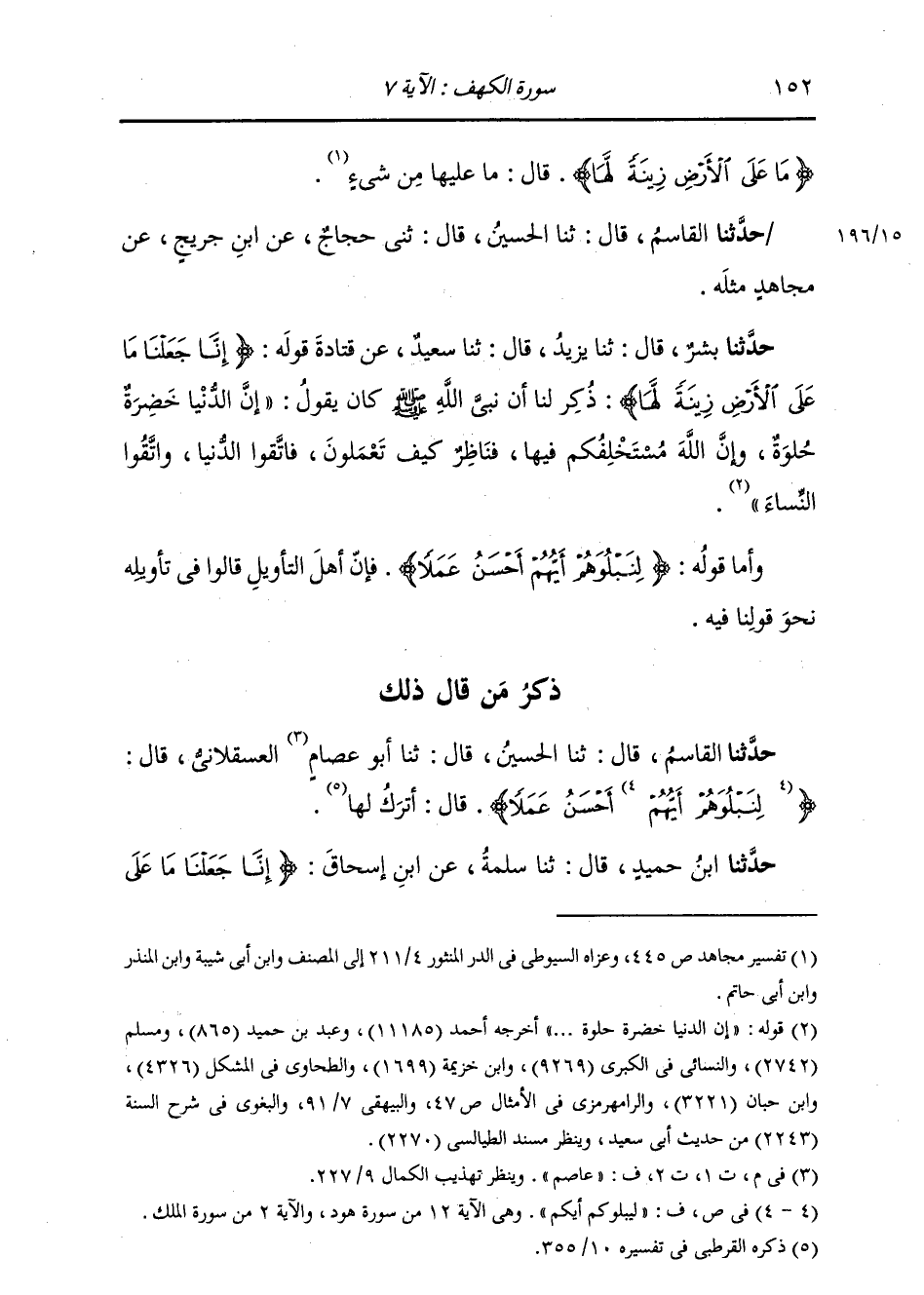 حَدَّثَنَا بِشْرٌ، قَالَ: ثنا يَزِيدُ، قَالَ: ثنا سَعِيدٌ، عَنْ قَتَادَةَ قَوْلُهُ: {إِنَّا جَعَلْنَا مَا عَلَى الْأَرْضِ زِينَةً لَهَا} [الكهف: 7] ذُكِرَ لَنَا أَنَّ نَبِيَّ اللَّهِ صَلَّى اللهُ عَلَيْهِ وَسَلَّمَ كَانَ يَقُولُ: «§إِنَّ الدُّنْيَا خَضِرَةٌ حُلْوَةٌ، وَإِنَّ اللَّهَ مُسْتَخْلِفُكُمْ فِيهَا، فَنَاظِرٌ كَيْفَ تَعْمَلُونَ، فَاتَّقُوا الدُّنْيَا، وَاتَّقُوا النِّسَاءَ»