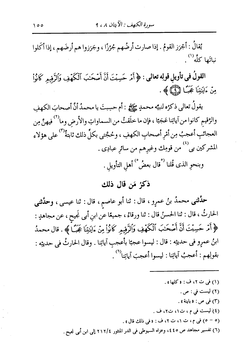 §الْقَوْلُ فِي تَأْوِيلِ قَوْلِهِ تَعَالَى: {أَمْ حَسِبْتَ أَنَّ أَصْحَابَ الْكَهْفِ وَالرَّقِيمِ كَانُوا مِنْ آيَاتِنَا عَجَبًا} [الكهف: 9] يَقُولُ تَعَالَى ذِكْرُهُ لِنَبِيِّهِ مُحَمَّدٍ صَلَّى اللهُ عَلَيْهِ وَسَلَّمَ: أَمْ حَسِبْتَ يَا مُحَمَّدُ أَنَّ أَصْحَابَ الْكَهْفِ وَالرَّقِيمِ كَانُوا مِنْ آيَاتِنَا عَجَبًا، فَإِنَّ مَا خَلَقْتُ مِنَ السَّمَاوَاتِ وَالْأَرْضِ، وَمَا فِيهِنَّ مِنَ الْعَجَائِبِ أَعْجَبُ مِنْ أَمْرِ أَصْحَابِ الْكَهْفِ، وَحُجَّتِي بِكُلِّ ذَلِكَ ثَابِتَةٌ عَلَى هَؤُلَاءِ الْمُشْرِكِينَ مِنْ قَوْمِكَ، وَغَيْرِهِمْ مِنْ سَائِرِ عِبَادِي. وَبِنَحْوِ الَّذِي قُلْنَا فِي ذَلِكَ، قَالَ أَهْلُ التَّأْوِيلِ