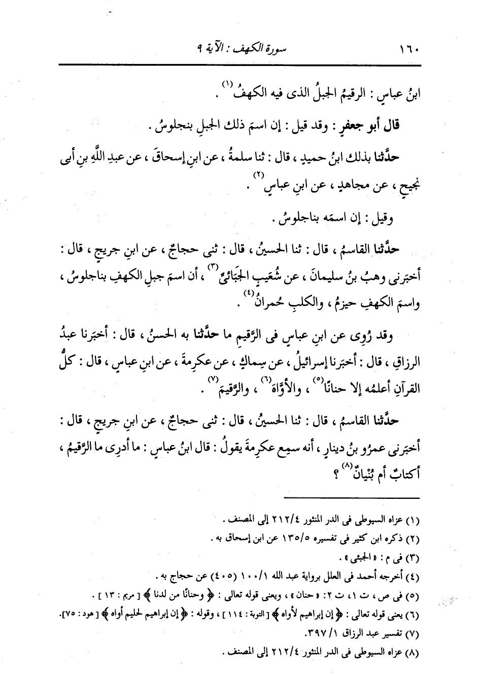 حَدَّثَنَا الْقَاسِمُ، قَالَ: ثنا الْحُسَيْنُ، قَالَ: ثني حَجَّاجٌ، عَنِ ابْنِ جُرَيْجٍ، قَالَ: أَخْبَرَنِي وَهْبُ بْنُ سُلَيْمَانَ، عَنْ شُعَيْبٍ الْجَبِئِيِّ، §أَنَّ اسْمَ، جَبَلِ الْكَهْفِ: بَنَاجُلُوسُ. وَاسْمُ الْكَهْفِ: حَيْزَمُ. وَالْكَلْبُ: خُمْرَانُ وَقَدْ رُوِيَ عَنِ ابْنِ عَبَّاسٍ، فِي الرَّقِيمِ مَا:
