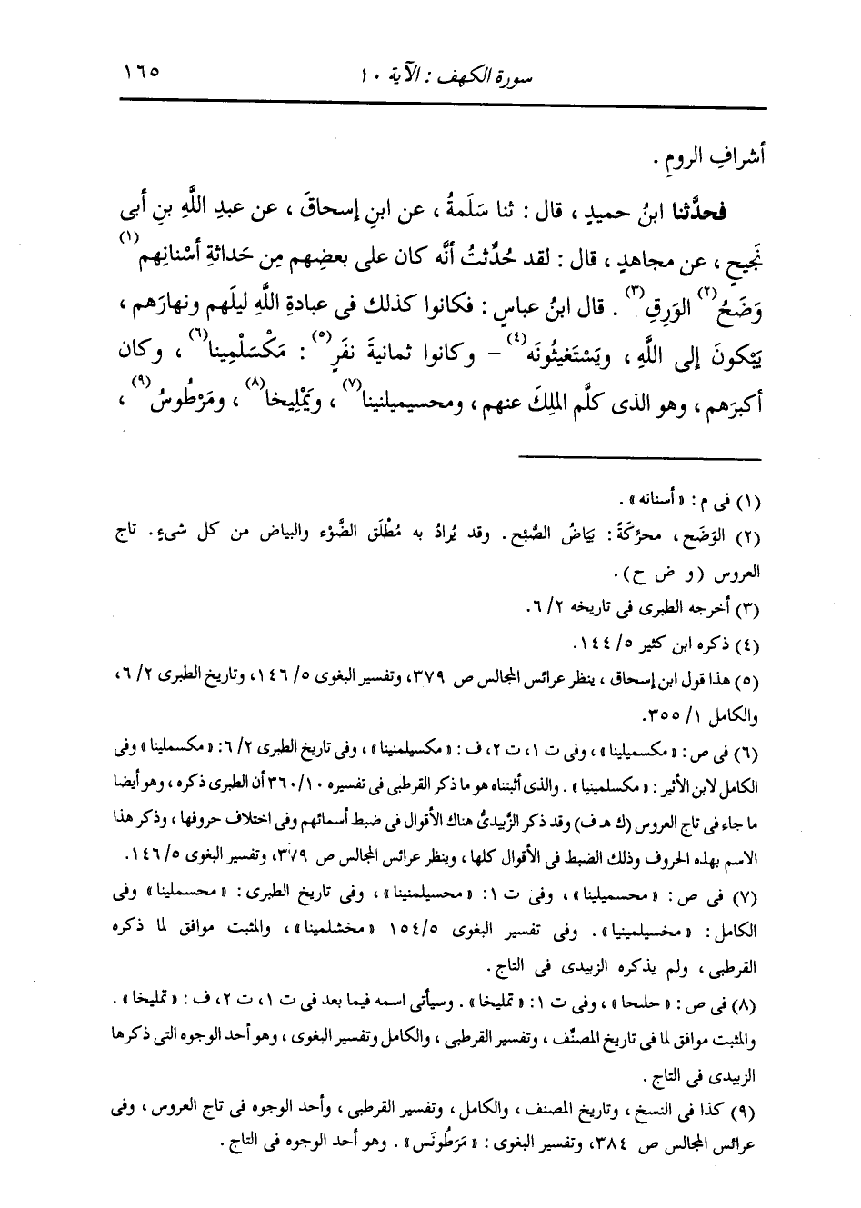فَحَدَّثَنَا ابْنُ حُمَيْدٍ، قَالَ: ثنا سَلَمَةُ، عَنِ ابْنِ إِسْحَاقَ، عَنْ عَبْدِ اللَّهِ بْنِ أَبِي نَجِيحٍ، عَنْ مُجَاهِدٍ، قَالَ: لَقَدْ حُدِّثْتُ أَنَّهُ كَانَ عَلَى بَعْضِهِمْ مِنْ حَدَاثَةِ أَسْنَانِهِ وَضَحٌ. قَالَ ابْنُ عَبَّاسٍ: §فَكَانُوا كَذَلِكَ فِي عِبَادَةِ اللَّهِ لَيْلَهُمْ وَنَهَارَهُمْ يَبْكُونَ إِلَى اللَّهِ، وَيَسْتَغِيثُونَهُ، وَكَانُوا ثَمَانِيَةَ نَفَرٍ: مَكْسِلْمِينَا، وَكَانَ أَكْبَرَهُمْ، وَهُوَ الَّذِي كَلَّمَ الْمَلِكَ عَنْهُمْ، وَمحسيميلنينا، وَيمليخا، وَمرطوس،