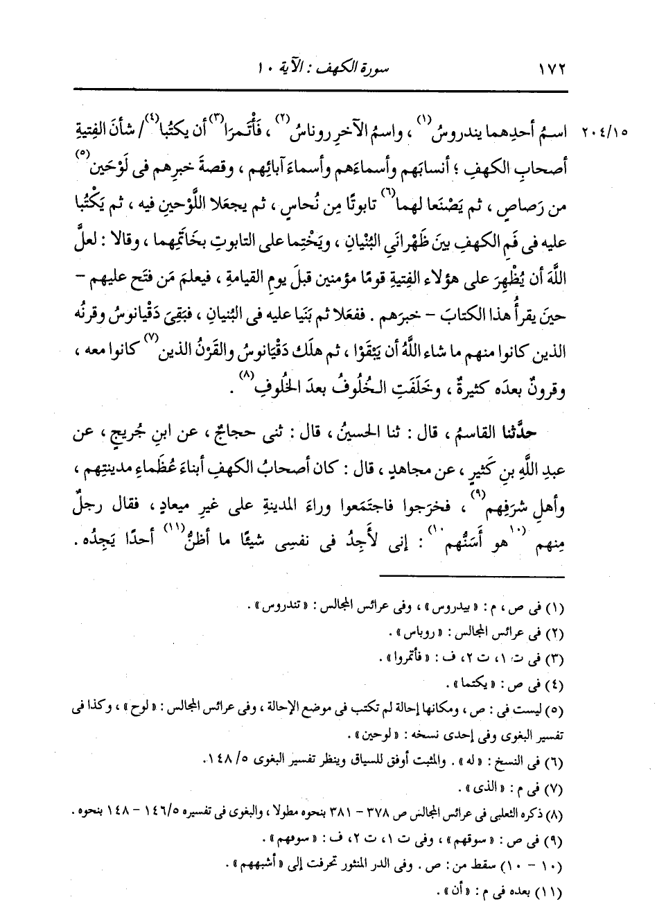 حَدَّثَنَا الْقَاسِمُ، قَالَ: ثنا الْحُسَيْنُ، قَالَ: ثني حَجَّاجٌ، عَنِ ابْنِ جُرَيْجٍ، عَنْ عَبْدِ اللَّهِ بْنِ كَثِيرٍ، عَنْ مُجَاهِدٍ، قَالَ: كَانَ §أَصْحَابُ الْكَهْفِ أَبْنَاءَ عُظَمَاءِ مَدِينَتِهِمْ، وَأَهْلِ شَرَفِهِمْ، فَخَرَجُوا فَاجْتَمَعُوا وَرَاءَ الْمَدِينَةِ عَلَى غَيْرِ مِيعَادٍ، فَقَالَ رَجُلٌ مِنْهُمْ هُوَ أَسَنُّهُمْ: إِنِّي لَأَجِدُ فِي نَفْسِي شَيْئًا مَا أَظُنُّ أَنَّ أَحَدًا يَجِدُهُ، -[173]- قَالُوا: مَاذَا تَجِدُ؟ قَالَ: أَجِدُ فِي نَفْسِي أَنَّ رَبِّي رَبُّ السَّمَاوَاتِ وَالْأَرْضِ، وَقَالُوا: نَحْنُ نَجِدُ، فَقَامُوا جَمِيعًا، فَقَالُوا: {رَبُّنَا رَبُّ السَّمَوَاتِ وَالْأَرْضِ لَنْ نَدْعُوَ مِنْ دُونِهِ إِلَهًا لَقَدْ قُلْنَا إِذًا شَطَطًا} فَاجْتَمَعُوا أَنْ يَدْخُلُوا الْكَهْفَ، وَعَلَى مَدِينَتِهِمْ إِذْ ذَاكَ جَبَّارٌ يُقَالُ لَهُ دقينوس فَلَبِثُوا فِي الْكَهْفِ ثَلَاثَماِئَةٍ سِنِينَ وَازْدَادُوا تِسْعًا رُقَّدًا