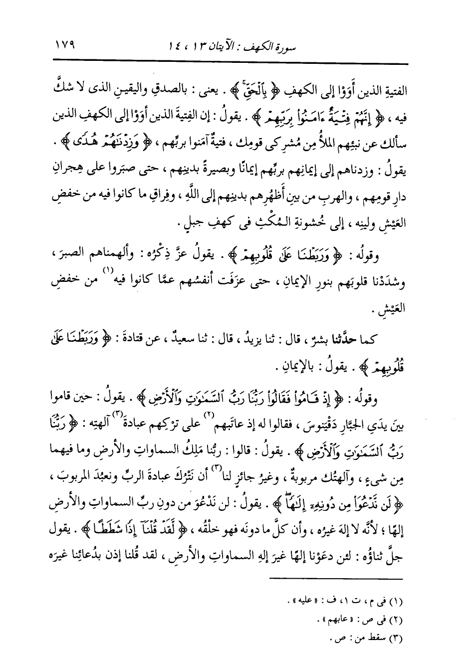 حَدَّثَنَا بِشْرٌ، قَالَ: ثنا يَزِيدُ، قَالَ: ثنا سَعِيدٌ، عَنْ قَتَادَةَ، {§وَرَبَطْنَا عَلَى قُلُوبِهِمْ} [الكهف: 14] يَقُولُ: بِالْإِيمَانِ