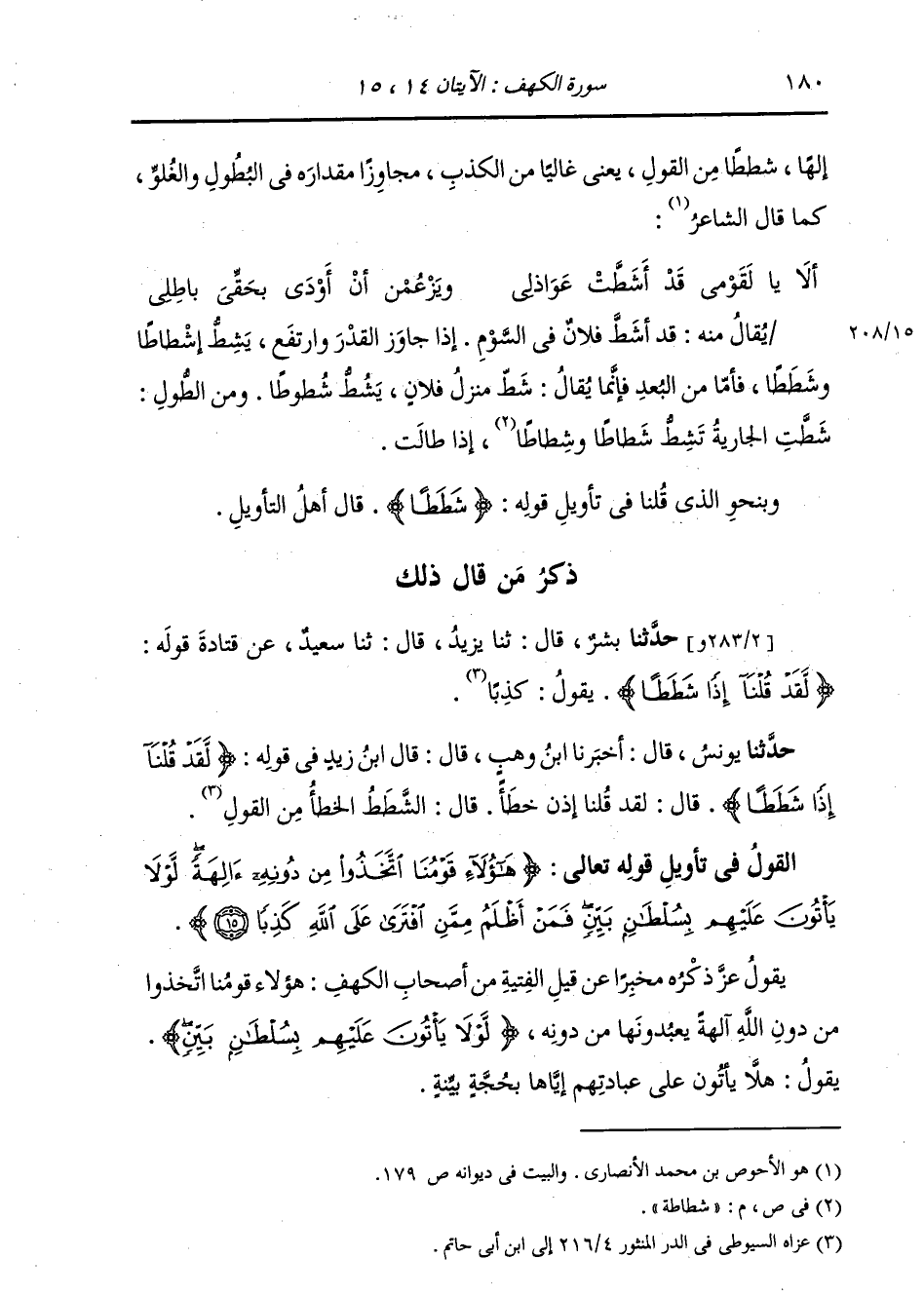 ذِكْرُ مَنْ قَالَ ذَلِكَ: حَدَّثَنَا بِشْرٌ، قَالَ: ثنا يَزِيدُ، قَالَ: ثنا سَعِيدٌ، عَنْ قَتَادَةَ، قَوْلُهُ {§لَقَدْ قُلْنَا إِذَا شَطَطًا} [الكهف: 14] يَقُولُ كَذِبًا