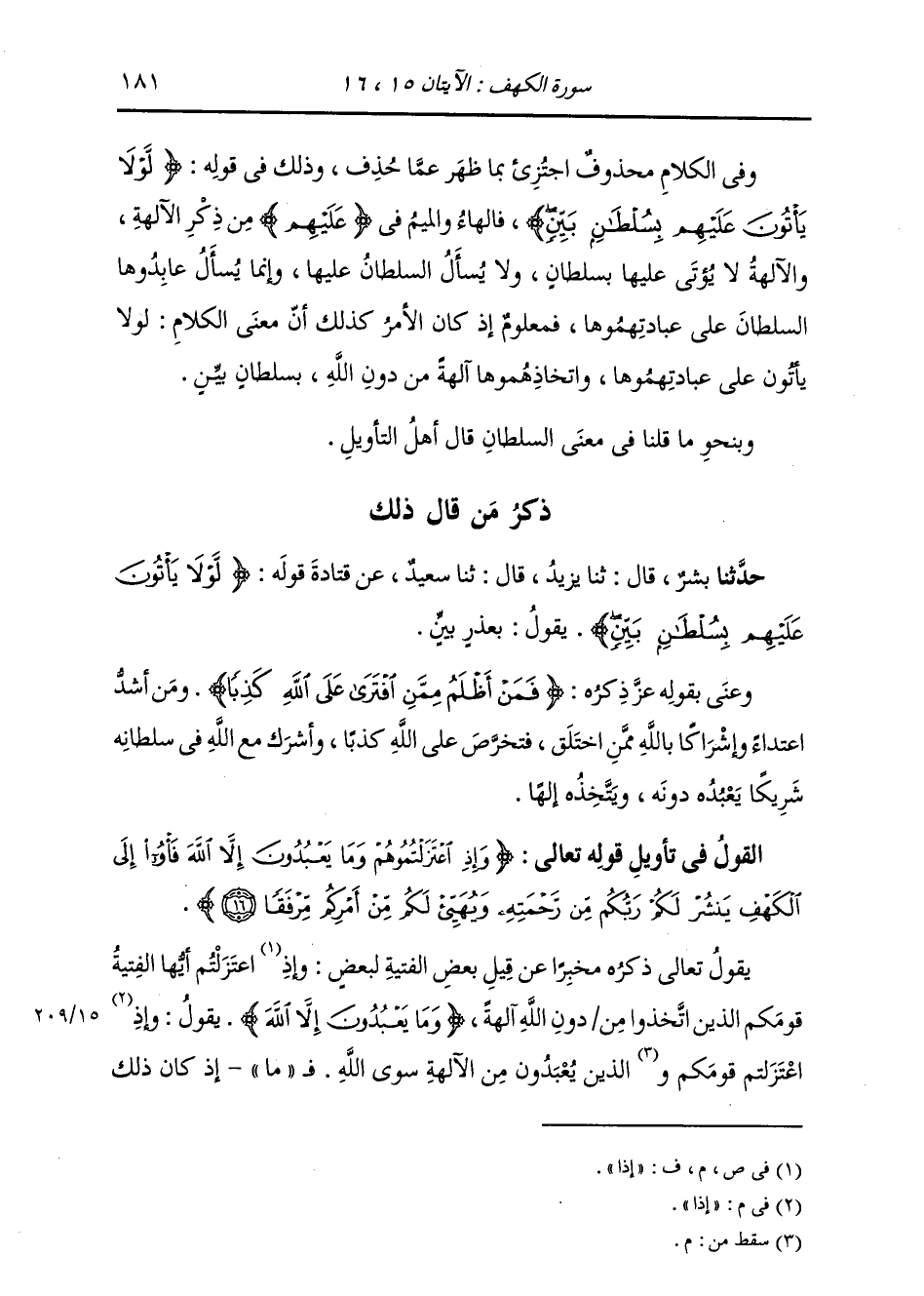 وَفِي الْكَلَامِ مَحْذُوفٌ اجْتُزِئَ بِمَا ظَهَرَ عَمَّا حُذِفَ، وَذَلِكَ فِي قَوْلِهِ: {لَوْلَا يَأْتُونَ عَلَيْهِمْ بِسُلْطَانٍ بَيِّنٍ} [الكهف: 15] فَالْهَاءُ وَالْمِيمُ فِي عَلَيْهِمْ مِنْ ذِكْرِ الْآلِهَةِ، وَالْآلِهَةُ لَا يُؤْتَى عَلَيْهَا بِسُلْطَانٍ، وَلَا يَسْأَلُ السُّلْطَانُ عَلَيْهَا، وَإِنَّمَا يُسْأَلُ عَابِدُوهَا السُّلْطَانَ عَلَى عِبَادَتِهِمُوهَا، فَمَعْلُومٌ إِذْ كَانَ الْأَمْرُ كَذَلِكَ، أَنَّ مَعْنَى الْكَلَامِ: لَوْلَا يَأْتُونَ عَلَى عِبَادَتِهِمُوهَا، وَاتِّخَاذِهِمُوهَا آلِهَةً مِنْ دُونِ اللَّهِ بِسُلْطَانٍ بَيِّنٍ. وَبِنَحْوِ مَا قُلْنَا فِي مَعْنَى السُّلْطَانِ، قَالَ أَهْلُ التَّأْوِيلِ