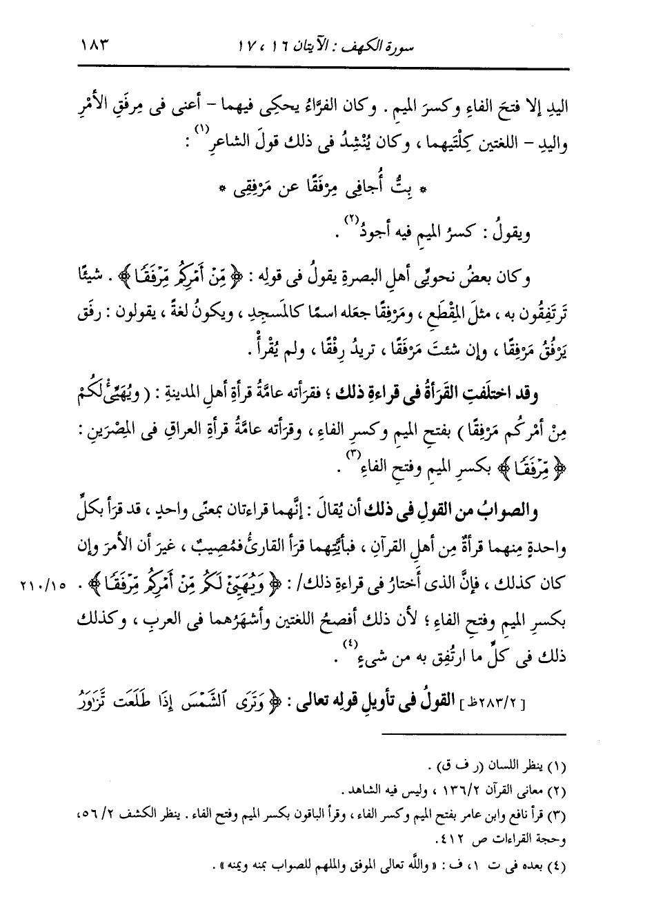 وَيَقُولُ: كَسْرُ الْمِيمِ فِيهِ أَجْوَدُ. وَكَانَ بَعْضُ نَحْوِيِّي أَهْلِ الْبَصْرَةِ يَقُولُ فِي قَوْلِهِ: {مِنْ أَمْرِكُمْ مِرْفَقًا} [الكهف: 16] شَيْئًا تَرْتَفِقُونَ بِهِ مِثْلَ الْمِقْطَعِ، وَمَرْفِقًا جَعَلَهُ اسْمًا كَالْمَسْجِدِ، وَيَكُونُ لُغَةً، يَقُولُونَ: رَفَقَ يَرْفُقُ مَرْفَقًا، وَإِنْ شِئْتَ مَرْفَقًا تُرِيدُ رِفْقًا وَلَمْ يُقْرَأْ. وَقَدِ اخْتَلَفَتِ الْقُرَّاءُ فِي قِرَاءَةِ ذَلِكَ. فَقَرَأَتْهُ عَامَّةُ قُرَّاءِ أَهْلِ الْمَدِينَةِ: «وَيُهَيِّئُ لَكُمْ مِنْ أَمْرِكُمْ مَرْفَقًا» بِفَتْحِ الْمِيمِ وَكَسْرِ الْفَاءِ، وَقَرَأَتْهُ عَامَّةُ قُرَّاءِ الْعِرَاقِ فِي الْمِصْرَيْنِ {مِرْفَقًا} [الكهف: 16] بِكَسْرِ الْمِيمِ وَفَتْحِ الْفَاءِ. وَالصَّوَابُ مِنَ الْقَوْلِ فِي ذَلِكَ أَنْ يُقَالَ: إِنَّهُمَا قِرَاءَتَانِ بِمَعْنًى وَاحِدٍ، قَدْ قَرَأَ بِكُلِّ وَاحِدَةٍ مِنْهُمَا قُرَّاءٌ مِنْ أَهْلِ الْقُرْآنِ، فَبِأَيَّتِهِمَا قَرَأَ الْقَارِئُ فَمُصِيبٌ. غَيْرَ أَنَّ الْأَمْرَ وَإِنْ كَانَ كَذَلِكَ، فَإِنَّ الَّذِي أَخْتَارُ فِي قِرَاءَةِ ذَلِكَ: {وَيُهَيِّئُ لَكُمْ مِنْ أَمْرِكُمْ مِرْفَقًا} [الكهف: 16] بِكَسْرِ الْمِيمِ وَفَتْحِ الْفَاءِ، لِأَنَّ ذَلِكَ أَفْصَحُ اللُّغَتَيْنِ وَأَشْهَرُهُمَا فِي الْعَرَبِ، وَكَذَلِكَ ذَلِكَ فِي كُلِّ مَا ارْتُفِقَ بِهِ مِنْ شَيْءٍ