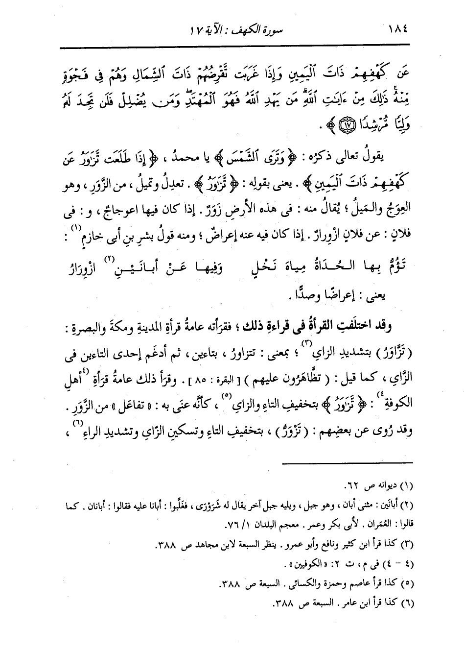 عَنْ كَهْفِهِمْ ذَاتَ الْيَمِينِ وَإِذَا غَرَبَتْ تَقْرِضُهُمْ ذَاتَ الشِّمَالِ وَهُمْ فِي فَجْوَةٍ مِنْهُ ذَلِكَ مِنْ آيَاتِ اللَّهِ مَنْ يَهْدِ اللَّهُ فَهُوَ الْمُهْتَدِ وَمَنْ يُضْلِلْ فَلَنْ تَجِدَ لَهُ وَلِيًّا مُرْشِدًا} يَقُولُ تَعَالَى ذِكْرُهُ {وَتَرَى الشَّمْسَ} [الكهف: 17] يَا مُحَمَّدُ {إِذَا طَلَعَتْ تَزَاوَرُ عَنْ كَهْفِهِمْ ذَاتَ الْيَمِينِ} [الكهف: 17] يَعْنِي بِقَوْلِهِ: {تَزَاوَرُ} [الكهف: 17] تَعْدِلُ وَتَمِيلُ، مِنَ الزَّوَرِ: وَهُوَ الْعِوَجُ وَالْمَيْلُ، يُقَالُ مِنْهُ: فِي هَذِهِ الْأَرْضِ زَوَرٌ: إِذَا كَانَ فِيهَا اعْوِجَاجٌ، وَفِي فُلَانٍ عَنْ فُلَانِ ازْوِرَارٌ، إِذَا كَانَ فِيهِ عَنْهُ أَعْرَاضٌ، وَمِنْهُ قَوْلُ بِشْرِ بْنِ أَبِي خَازِمٍ: