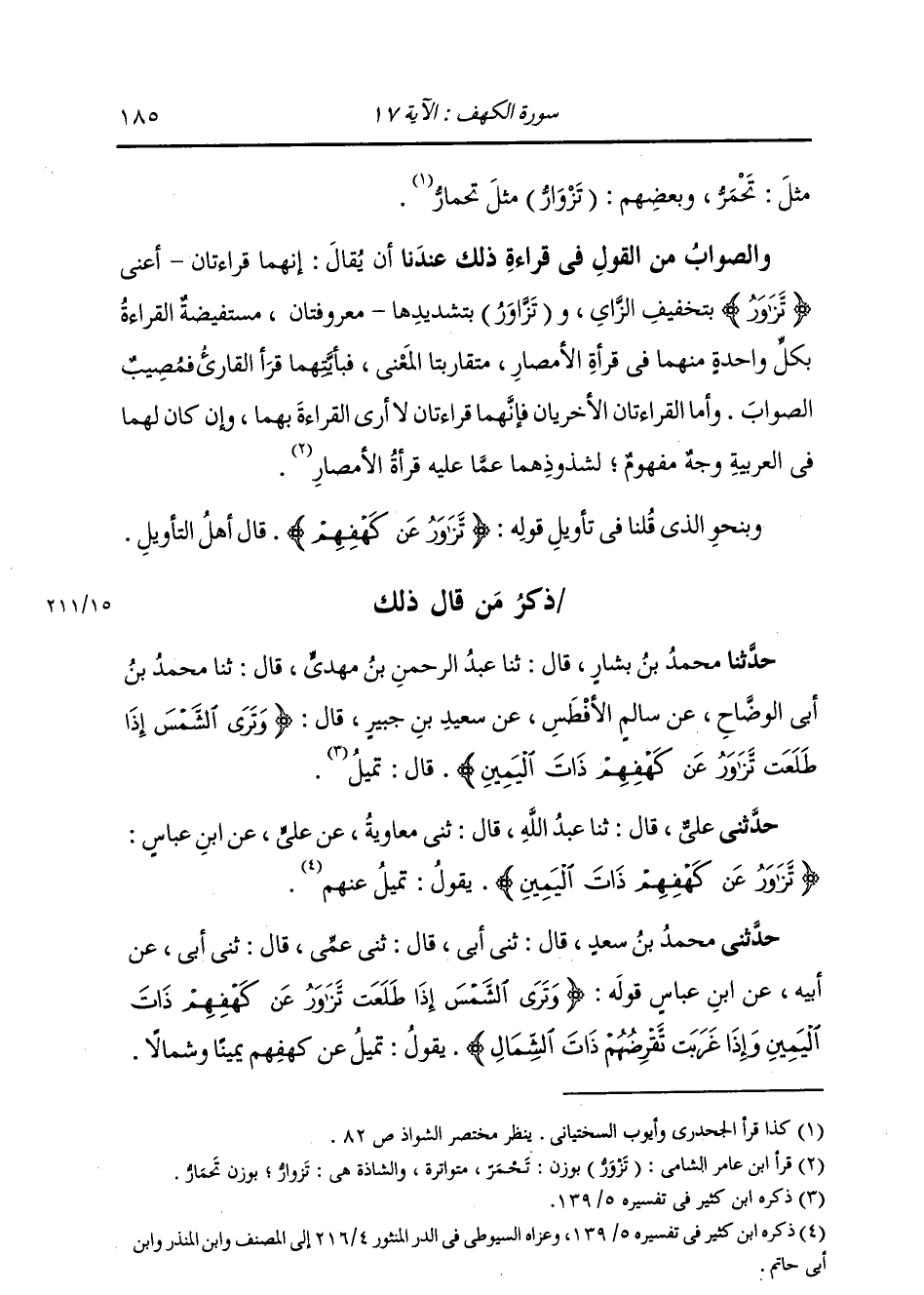 مِثْلَ تَحْمَرُّ، وَبَعْضُهُمْ: «تَزْوَارُّ» مِثْلَ تَحْمَارُّ. وَالصَّوَابُ مِنَ الْقَوْلِ فِي قِرَاءَةِ ذَلِكَ عِنْدَنَا أَنْ يُقَالَ: إِنَّهُمَا قِرَاءَتَانِ، أَعِنِّي {تَزَاوَرُ} [الكهف: 17] بِتَخْفِيفِ الزايِ، وَ (تَزَّاوَرُ) بَتْشِدِيدِهَا مَعْرُوفَتَانِ، مُسْتَفِيضَةٌ الْقِرَاءَةُ بِكُلِّ وَاحِدَةٍ مِنْهُمَا فِي قُرَّاءِ الْأَمْصَارِ، مُتَقَارِبَتَا الْمَعْنَى، فَبِأَيَّتِهِمَا قَرَأَ الْقَارِئُ فَمُصِيبٌ الصَّوَابَ. وَأَمَّا الْقِرَاءَتَانِ الْأُخْرَيَانِ فَإِنَّهُمَا قِرَاءَتَانِ لَا أَرَى الْقِرَاءَةَ بِهِمَا، وَإِنْ كَانَ لَهُمَا فِي الْعَرَبِيَّةِ وَجْهٌ مَفْهُومٌ، لِشُذُوذِهِمَا عَمَّا عَلَيْهِ قَرَأَهُ الْأَمْصَارُ. وَبِنَحْوِ الَّذِي قُلْنَا فِي تَأْوِيلِ قَوْلِهِ {تَزَاوَرُ عَنْ كَهْفِهِمْ} [الكهف: 17] قَالَ أَهْلُ التَّأْوِيلِ