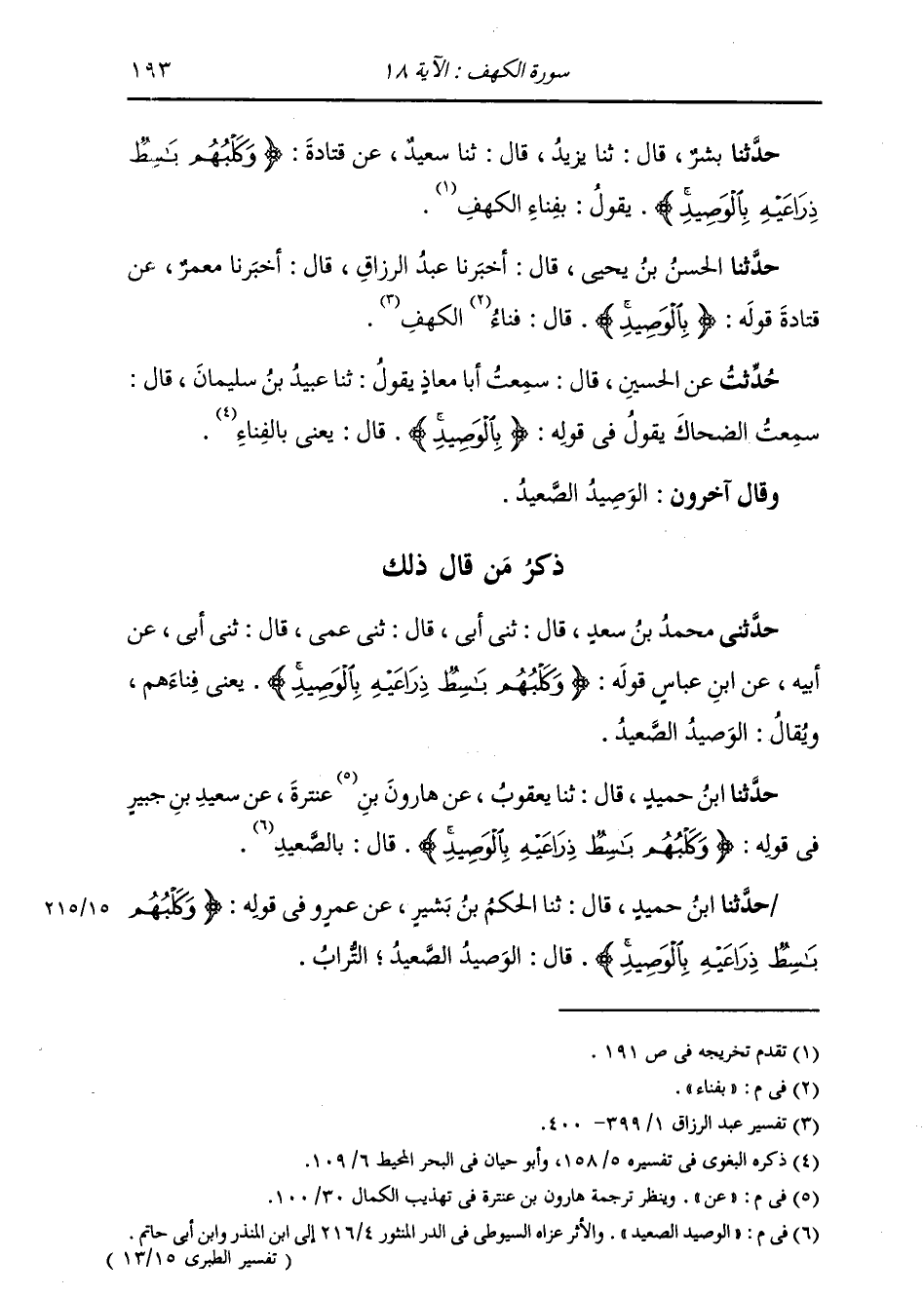 حَدَّثَنَا ابْنُ حُمَيْدٍ، قَالَ: ثنا يَعْقُوبُ، عَنْ هَارُونَ، عَنْ عَنْتَرَةَ، عَنْ سَعِيدِ بْنِ جُبَيْرٍ، فِي قَوْلِهِ: {§وَكَلْبُهُمْ بَاسِطٌ ذِرَاعَيْهِ بِالْوَصِيدِ} [الكهف: 18] قَالَ: الْوَصِيدُ: الصَّعِيدُ